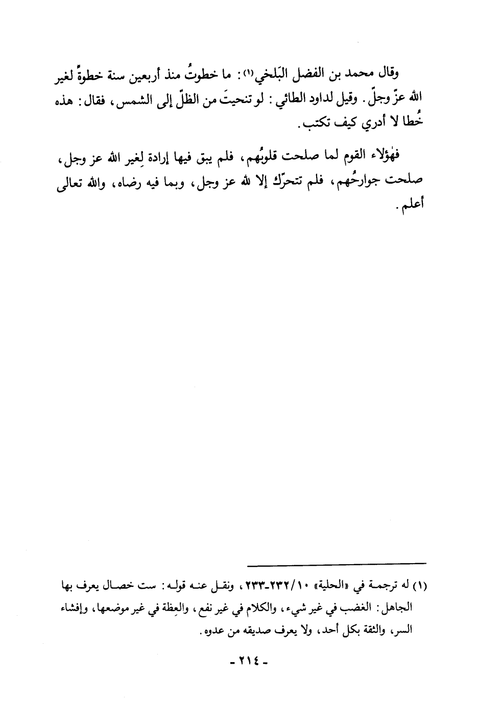 وَقَالَ مُحَمَّدُ بْنُ الْفَضْلِ الْبَلْخِيُّ: مَا خَطَوْتُ مُنْذُ أَرْبَعِينَ سَنَةً خُطْوَةً لِغَيْرِ اللَّهِ عَزَّ وَجَلَّ. وَقِيلَ لِدَاوُدَ الطَّائِيِّ: لَوْ تَنَحَّيْتَ مِنَ الظِّلِّ إِلَى الشَّمْسِ، فَقَالَ: هَذِهِ خُطًى لَا أَدْرِي كَيْفَ تُكْتَبُ. فَهَؤُلَاءِ الْقَوْمُ لَمَّا صَلَحَتْ قُلُوبُهُمْ، فَلَمْ يَبْقَ فِيهَا إِرَادَةٌ لِغَيْرِ اللَّهِ عَزَّ وَجَلَّ، صَلَحَتْ جَوَارِحُهُمْ، فَلَمْ تَتَحَرَّكْ إِلَّا لِلَّهِ عَزَّ وَجَلَّ، وَبِمَا فِيهِ رِضَاهُ، وَاللَّهُ تَعَالَى أَعْلَمُ.