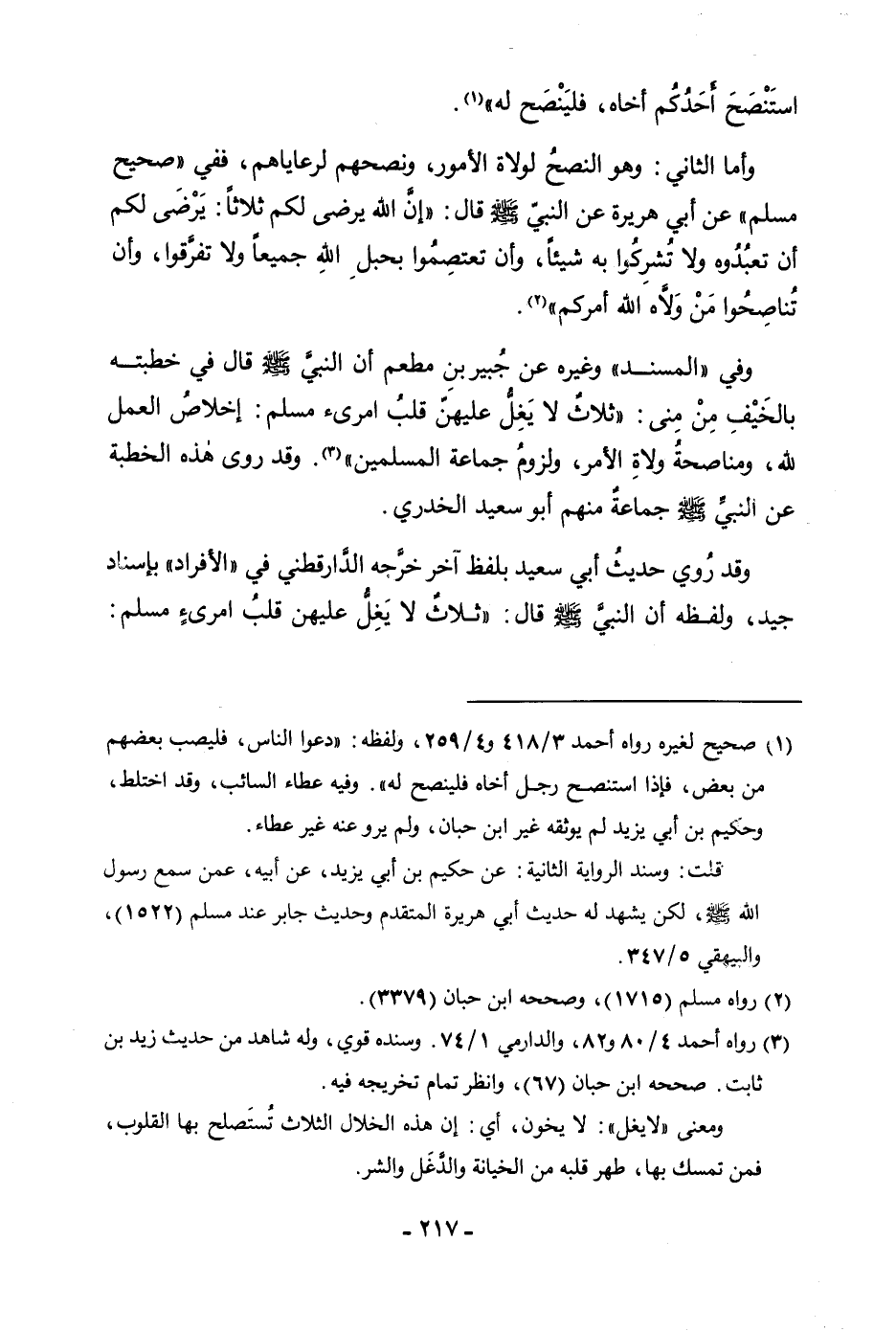 اسْتَنْصَحَ أَحَدُكُمْ أَخَاهُ، فَلْيَنْصَحْ لَهُ» . وَأَمَّا الثَّانِي: وَهُوَ النُّصْحُ لِوُلَاةِ الْأُمُورِ، وَنُصْحُهُمْ لِرَعَايَاهُمْ، فَفِي " صَحِيحِ مُسْلِمٍ " عَنْ أَبِي هُرَيْرَةَ، عَنِ النَّبِيِّ صَلَّى اللَّهُ عَلَيْهِ وَسَلَّمَ قَالَ: «إِنَّ اللَّهَ يَرْضَى لَكُمْ ثَلَاثًا: يَرْضَى لَكُمْ أَنْ تَعْبُدُوهُ وَلَا تُشْرِكُوا بِهِ شَيْئًا، وَأَنْ تَعْتَصِمُوا بِحَبْلِ اللَّهِ جَمِيعًا وَلَا تَفَرَّقُوا، وَأَنْ تَنَاصَحُوا مَنْ وَلَّاهُ اللَّهُ أَمْرَكُمْ» . وَفِي " الْمُسْنَدِ " وَغَيْرِهِ عَنْ جُبَيْرِ بْنِ مُطْعِمٍ أَنَّ النَّبِيَّ صَلَّى اللَّهُ عَلَيْهِ وَسَلَّمَ قَالَ: فِي خُطْبَتِهِ بِالْخَيْفِ مِنْ مِنًى «ثَلَاثٌ لَا يُغِلُّ عَلَيْهِنَّ قَلْبُ امْرِئٍ مُسْلِمٍ: إِخْلَاصُ الْعَمَلِ لِلَّهِ، وَمُنَاصَحَةُ وُلَاةِ الْأَمْرِ، وَلُزُومُ جَمَاعَةِ الْمُسْلِمِينَ» وَقَدْ رَوَى هَذِهِ الْخُطْبَةَ عَنِ النَّبِيِّ صَلَّى اللَّهُ عَلَيْهِ وَسَلَّمَ جَمَاعَةٌ مِنْهُمْ أَبُو سَعِيدٍ الْخُدْرِيُّ. وَقَدْ رُوِيَ مِنْ حَدِيثِ أَبِي سَعِيدٍ بِلَفْظٍ آخَرَ خَرَجَّهُ الدَّارَقُطْنِيُّ فِي " الْأَفْرَادِ " بِإِسْنَادٍ جَيِّدٍ، وَلَفْظُهُ أَنَّ النَّبِيَّ صَلَّى اللَّهُ عَلَيْهِ وَسَلَّمَ قَالَ: «ثَلَاثٌ لَا يُغِلُّ عَلَيْهِنَّ قَلْبُ امْرِئٍ مُسْلِمٍ: