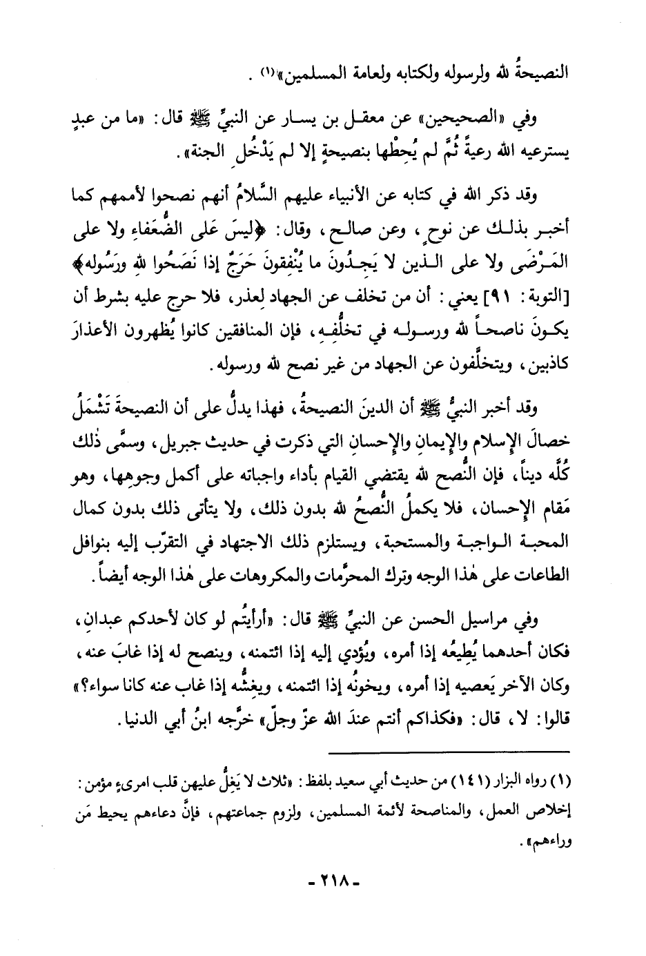 النَّصِيحَةُ لِلَّهِ وَلِرَسُولِهِ وَلِكِتَابِهِ وَلِعَامَّةِ الْمُسْلِمِينَ» . وَفِي " الصَّحِيحَيْنِ " عَنْ مَعْقِلِ بْنِ يَسَارٍ، عَنِ النَّبِيِّ صَلَّى اللَّهُ عَلَيْهِ وَسَلَّمَ قَالَ: «مَا مِنْ عَبْدٍ يَسْتَرْعِيهِ اللَّهُ رَعِيَّةً ثُمَّ لَمَّ يَحُطُّهَا بِنَصِيحَةٍ إِلَّا لَمْ يَدْخُلِ الْجَنَّةَ» . وَقَدْ ذَكَرَ اللَّهُ فِي كِتَابِهِ عَنِ الْأَنْبِيَاءِ عَلَيْهِمُ السَّلَامُ أَنَّهُمْ نَصَحُوا لِأُمَمِهِمْ كَمَا أَخْبَرَ اللَّهُ بِذَلِكَ عَنْ نُوحٍ، وَعَنْ صَالِحٍ وَقَالَ: {لَيْسَ عَلَى الضُّعَفَاءِ وَلَا عَلَى الْمَرْضَى وَلَا عَلَى الَّذِينَ لَا يَجِدُونَ مَا يُنْفِقُونَ حَرَجٌ إِذَا نَصَحُوا لِلَّهِ وَرَسُولِهِ} [التوبة: 91] (التَّوْبَةِ: 91) يَعْنِي: أَنَّ مَنْ تَخَلَّفَ عَنِ الْجِهَادِ لِعُذْرٍ، فَلَا حَرَجَ عَلَيْهِ بِشَرْطِ أَنْ يَكُونَ نَاصِحًا لِلَّهِ وَرَسُولِهِ فِي تَخَلُّفِهِ، فَإِنَّ الْمُنَافِقِينَ كَانُوا يُظْهِرُونَ الْأَعْذَارَ كَاذِبِينَ، وَيَتَخَلَّفُونَ عَنِ الْجِهَادِ مِنْ غَيْرِ نُصْحٍ لِلَّهِ وَرَسُولِهِ. وَقَدْ أَخْبَرَ النَّبِيُّ صَلَّى اللَّهُ عَلَيْهِ وَسَلَّمَ أَنَّ الدِّينَ النَّصِيحَةُ، فَهَذَا يَدُلُّ عَلَى أَنَّ النَّصِيحَةَ تَشْمَلُ خِصَالَ الْإِسْلَامِ وَالْإِيمَانِ وَالْإِحْسَانِ الَّتِي ذُكِرَتْ فِي حَدِيثِ جِبْرِيلَ، وَسَمَّى ذَلِكَ كُلَّهُ دِينًا، فَإِنَّ النُّصْحَ لِلَّهِ يَقْتَضِي الْقِيَامَ بِأَدَاءِ وَاجِبَاتِهِ عَلَى أَكْمَلِ وُجُوهِهَا، وَهُوَ مَقَامُ الْإِحْسَانِ، فَلَا يَكْمُلُ النُّصْحُ لِلَّهِ بِدُونِ ذَلِكَ، وَلَا يَتَأَتَّى ذَلِكَ بِدُونِ كَمَالِ الْمَحَبَّةِ الْوَاجِبَةِ وَالْمُسْتَحَبَّةِ، وَيَسْتَلْزِمُ ذَلِكَ الِاجْتِهَادَ فِي التَّقَرُّبِ إِلَيْهِ بِنَوَافِلِ الطَّاعَاتِ عَلَى هَذَا الْوَجْهِ وَتَرْكِ الْمُحَرَّمَاتِ وَالْمَكْرُوهَاتِ عَلَى هَذَا الْوَجْهِ أَيْضًا. وَفِي مَرَاسِيلِ الْحَسَنِ عَنِ النَّبِيِّ صَلَّى اللَّهُ عَلَيْهِ وَسَلَّمَ قَالَ: «أَرَأَيْتُمْ لَوْ كَانَ لِأَحَدِكُمْ عَبْدَانِ، فَكَانَ أَحَدُهُمَا يُطِيعُهُ إِذَا أَمَرَهُ، وَيُؤَدِّي إِلَيْهِ إِذَا ائْتَمَنَهُ، وَيَنْصَحُ لَهُ إِذَا غَابَ عَنْهُ، وَكَانَ الْآخَرُ يَعْصِيهِ إِذَا أَمَرَهُ، وَيَخُونُهُ إِذَا ائْتَمَنَهُ، وَيَغُشُّهُ إِذَا غَابَ عَنْهُ كَانَا سَوَاءً؟ قَالُوا: لَا، قَالَ: فَكَذَاكُمْ أَنْتُمْ عِنْدَ اللَّهِ عَزَّ وَجَلَّ» خَرَّجَهُ ابْنُ أَبِي الدُّنْيَا.