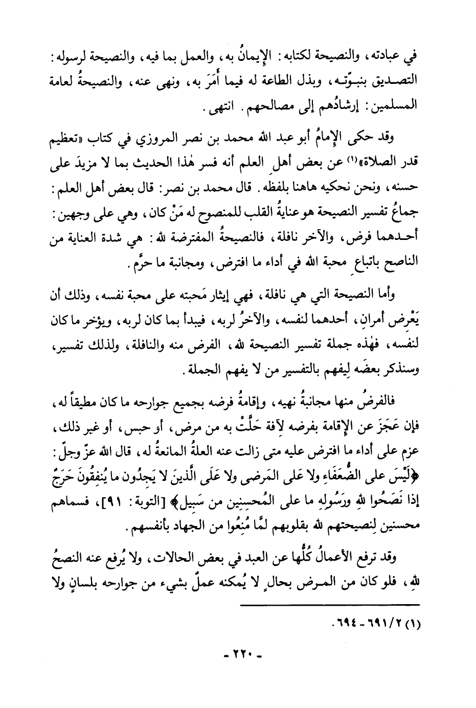 فِي عِبَادَتِهِ، وَالنَّصِيحَةُ لِكِتَابِهِ: الْإِيمَانُ بِهِ، وَالْعَمَلُ بِمَا فِيهِ، وَالنَّصِيحَةُ لِرَسُولِهِ: التَّصْدِيقُ بِنُبُوَّتِهِ، وَبَذْلُ الطَّاعَةِ لَهُ فِيمَا أَمَرَ بِهِ، وَنَهَى عَنْهُ، وَالنَّصِيحَةُ لِعَامَّةِ الْمُسْلِمِينَ: إِرْشَادُهُمْ إِلَى مَصَالِحِهِمْ. انْتَهِي. وَقَدْ حَكَى الْإِمَامُ أَبُو عَبْدِ اللَّهِ مُحَمَّدُ بْنُ نَصْرٍ الْمَرْوَزِيُّ فِي كِتَابِهِ " تَعْظِيمِ قَدْرِ الصَّلَاةِ " عَنْ بَعْضِ أَهْلِ الْعِلْمِ أَنَّهُ فَسَّرَ هَذَا الْحَدِيثَ بِمَا لَا مَزِيدَ عَلَى حُسْنِهِ، وَنَحْنُ نَحْكِيهِ هَاهُنَا بِلَفْظِهِ. قَالَ مُحَمَّدُ بْنُ نَصْرٍ: قَالَ بَعْضُ أَهْلِ الْعِلْمِ: جِمَاعُ تَفْسِيرِ النَّصِيحَةِ هُوَ عِنَايَةُ الْقَلْبِ لِلْمَنْصُوحِ لَهُ مَنْ كَانَ، وَهِيَ عَلَى وَجْهَيْنِ: أَحَدُهُمَا فَرْضٌ، وَالْآخَرُ نَافِلَةٌ، فَالنَّصِيحَةُ الْمُفْتَرِضَةُ لِلَّهِ: هِيَ شِدَّةُ الْعِنَايَةِ مِنَ النَّاصِحِ بِاتِّبَاعِ مَحَبَّةِ اللَّهِ فِي أَدَاءِ مَا افْتَرَضَ، وَمُجَانَبَةِ مَا حَرَّمَ. وَأَمَّا النَّصِيحَةُ الَّتِي هِيَ نَافِلَةٌ، فَهِيَ إِيثَارُ مَحَبَّتِهِ عَلَى مَحَبَّةِ نَفْسِهِ، وَذَلِكَ أَنْ يَعْرِضَ أَمْرَانِ، أَحَدُهُمَا لِنَفْسِهِ، وَالْآخَرُ لِرَبِّهِ، فَيَبْدَأُ بِمَا كَانَ لِرَبِّهِ، وَيُؤَخِّرُ مَا كَانَ لِنَفْسِهِ، فَهَذِهِ جُمْلَةُ تَفْسِيرِ النَّصِيحَةِ لِلَّهِ، الْفَرْضُ مِنْهُ وَالنَّافِلَةُ، وَلِذَلِكَ تَفْسِيرٌ، وَسَنَذْكُرُ بَعْضَهُ لِيَفْهَمَ بِالتَّفْسِيرِ مَنْ لَا يَفْهَمُ بِالْجُمْلَةِ. فَالْفَرْضُ مِنْهَا مُجَانَبَةُ نَهْيِهِ، وَإِقَامَةُ فَرْضِهِ بِجَمِيعِ جَوَارِحِهِ مَا كَانَ مُطِيقًا لَهُ، فَإِنْ عَجَرَ عَنِ الْإِقَامَةِ بِفَرْضِهِ لِآفَةٍ حَلَّتْ بِهِ مِنْ مَرَضٍ، أَوْ حَبْسٍ، أَوْ غَيْرِ ذَلِكَ، عَزَمَ عَلَى أَدَاءِ مَا افْتَرَضَ عَلَيْهِ مَتَى زَالَتْ عَنْهُ الْعِلَّةُ الْمَانِعَةُ لَهُ، قَالَ اللَّهُ عَزَّ وَجَلَّ {لَيْسَ عَلَى الضُّعَفَاءِ وَلَا عَلَى الْمَرْضَى وَلَا عَلَى الَّذِينَ لَا يَجِدُونَ مَا يُنْفِقُونَ حَرَجٌ إِذَا نَصَحُوا لِلَّهِ وَرَسُولِهِ مَا عَلَى الْمُحْسِنِينَ مِنْ سَبِيلٍ} [التوبة: 91] (التَّوْبَةِ: 91) ، فَسَمَّاهُمْ مُحْسِنِينَ لِنَصِيحَتِهِمْ لِلَّهِ بِقُلُوبِهِمْ لِمَا مَنَعُوا مِنَ الْجِهَادِ بِأَنْفُسِهِمْ. وَقَدْ تُرْفَعُ الْأَعْمَالُ كُلُّهَا عَنِ الْعَبْدِ فِي بَعْضِ الْحَالَاتِ، وَلَا يُرْفَعُ عَنْهُ النُّصْحُ لِلَّهِ، فَلَوْ كَانَ مِنَ الْمَرَضِ بِحَالٍ لَا يُمْكِنُهُ عَمَلٌ بِشَيْءٍ مِنْ جَوَارِحِهِ بِلِسَانٍ وَلَا