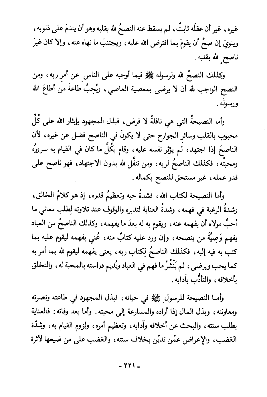 وَأَمَّا النَّصِيحَةُ لِكِتَابِ اللَّهِ، فَشِدَّةُ حُبِّهِ وَتَعْظِيمُ قَدْرِهِ، إِذْ هُوَ كَلَامُ الْخَالِقِ، وَشِدَّةُ الرَّغْبَةِ فِي فَهْمِهِ، وَشِدَّةُ الْعِنَايَةِ لِتَدَبُّرِهِ وَالْوُقُوفِ عِنْدَ تِلَاوَتِهِ لِطَلَبِ مَعَانِي مَا أَحَبَّ مَوْلَاهُ أَنْ يُفْهِمَهُ عَنْهُ، أَوْ يَقُومَ بِهِ لَهُ بَعْدَ مَا يُفْهِمُهُ، وَكَذَلِكَ النَّاصِحُ مِنَ الْعِبَادِ يَفْهَمُ وَصِيَّةَ مَنْ يَنْصَحُهُ، وَإِنْ وَرَدَ عَلَيْهِ كِتَابٌ مِنْهُ، عُنِيَ بِفَهْمِهِ لِيَقُومَ عَلَيْهِ بِمَا كَتَبَ بِهِ فِيهِ إِلَيْهِ، فَكَذَلِكَ النَّاصِحُ لِكِتَابِ رَبِّهِ، يُعْنَى بِفَهْمِهِ لِيَقُومَ لِلَّهِ بِمَا أَمَرَهُ بِهِ كَمَا يُحِبُّ وَيَرْضَى، ثُمَّ يَنْشُرُ مَا فَهِمَ فِي الْعِبَادِ وَيُدِيمُ دِرَاسَتَهُ بِالْمَحَبَّةِ لَهُ، وَالتَّخَلُّقِ بِأَخْلَاقِهِ، وَالتَّأَدُّبِ بِآدَابِهِ. وَأَمَّا النَّصِيحَةُ لِلرَّسُولِ صَلَّى اللَّهُ عَلَيْهِ وَسَلَّمَ فِي حَيَاتِهِ، فَبَذْلُ الْمَجْهُودِ فِي طَاعَتِهِ وَنُصْرَتِهِ وَمُعَاوَنَتِهِ، وَبَذْلُ الْمَالِ إِذَا أَرَادَهُ وَالْمُسَارَعَةُ إِلَى مَحَبَّتِهِ، وَأَمَّا بَعْدَ وَفَاتِهِ: فَالْعِنَايَةُ بِطَلَبِ سُنَّتِهِ، وَالْبَحْثُ عَنْ أَخْلَاقِهِ وَآدَابِهِ، وَتَعْظِيمُ أَمْرِهِ، وَلُزُومُ الْقِيَامِ بِهِ، وَشِدَّةُ الْغَضَبِ وَالْإِعْرَاضِ عَمَّنْ تَدَيَّنَ بِخِلَافِ سُنَّتِهِ، وَالْغَضَبُ عَلَى مَنْ ضَيَّعَهَا لِأَثَرَةِ