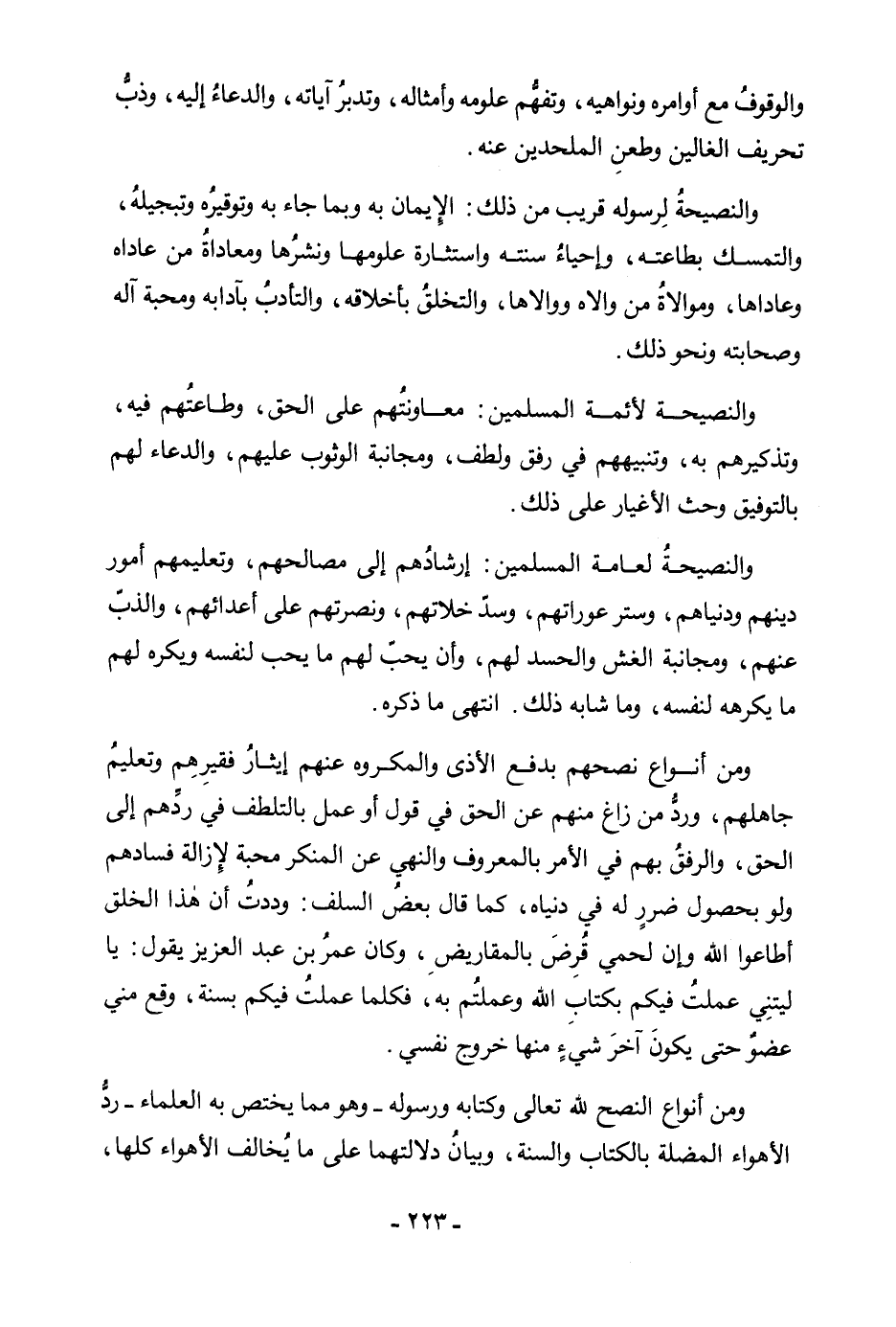 وَالْوُقُوفُ مَعَ أَوَامِرِهِ وَنَوَاهِيهِ، وَتَفَهُّمُ عُلُومِهِ وَأَمْثَالِهِ، وَتَدَبُّرُ آيَاتِهِ، وَالدُّعَاءُ إِلَيْهِ، وَذَبِّ تَحْرِيفِ الْغَالِينَ وَطَعْنِ الْمُلْحِدِينَ عَنْهُ. وَالنَّصِيحَةُ لِرَسُولِهِ قَرِيبٌ مِنْ ذَلِكَ: الْإِيمَانُ بِهِ وَبِمَا جَاءَ بِهِ وَتَوْقِيرُهُ وَتَبْجِيلُهُ، وَالتَّمَسُّكُ بِطَاعَتِهِ، وَإِحْيَاءُ سُنَّتِهِ وَاسْتِثَارَةُ عُلُومِهَا وَنَشْرُهَا وَمُعَادَاةُ مَنْ عَادَاهُ وَعَادَاهَا، وَمُوَالَاةُ مَنْ وَالَاهُ وَوَالَاهَا، وَالتَّخَلُّقُ بِأَخْلَاقِهِ، وَالتَّأَدُّبُ بِآدَابِهِ، وَمَحَبَّةُ آلِهِ وَصَحَابَتِهِ، وَنَحْوُ ذَلِكَ. وَالنَّصِيحَةُ لِأَئِمَّةِ الْمُسْلِمِينَ: مُعَاوَنَتُهُمْ عَلَى الْحَقِّ، وَطَاعَتُهُمْ فِيهِ، وَتَذْكِيرُهُمْ بِهِ، وَتَنْبِيهُهُمْ فِي رِفْقٍ وَلُطْفٍ، وَمُجَانَبَةُ الْوُثُوبِ عَلَيْهِمْ، وَالدُّعَاءُ لَهُمْ بِالتَّوْفِيقِ وَحَثُّ الْأَغْيَارِ عَلَى ذَلِكَ. وَالنَّصِيحَةُ لِعَامَّةِ الْمُسْلِمِينَ: إِرْشَادُهُمْ إِلَى مَصَالِحِهِمْ، وَتَعْلِيمُهُمْ أُمُورَ دِينِهِمْ وَدُنْيَاهُمْ، وَسِتْرُ عَوْرَاتِهِمْ، وَسَدُّ خَلَّاتِهِمْ، وَنُصْرَتُهُمْ عَلَى أَعْدَائِهِمْ، وَالذَّبُّ عَنْهُمْ، وَمُجَانَبَةُ الْغِشِّ، وَالْحَسَدُ لَهُمْ، وَأَنْ يُحِبَّ لَهُمْ مَا يُحِبُّ لِنَفْسِهِ، وَيَكْرَهَ لَهُمْ مَا يَكْرَهُهُ لِنَفْسِهِ، وَمَا شَابَهَ ذَلِكَ. انْتَهَى مَا ذَكَرَهُ. وَمِنْ أَنْوَاعِ نُصْحِهِمْ بِدَفْعِ الْأَذَى وَالْمَكْرُوهِ عَنْهُمْ إِيثَارُ فَقِيرِهِمْ وَتَعْلِيمُ جَاهِلِهِمْ، وَرَدُّ مَنْ زَاغَ مِنْهُمْ عَنِ الْحَقِّ فِي قَوْلٍ أَوْ عَمَلٍ بِالتَّلَطُّفِ فِي رَدِّهِمْ إِلَى الْحَقِّ، وَالرِّفْقُ بِهِمْ فِي الْأَمْرِ بِالْمَعْرُوفِ وَالنَّهْيِ عَنِ الْمُنْكَرِ مَحَبَّةً لِإِزَالَةِ فَسَادِهِمْ وَلَوْ بِحُصُولِ ضَرَرٍ لَهُ فِي دُنْيَاهُ، كَمَا قَالَ بَعْضُ السَّلَفِ: وَدِدْتُ أَنَّ هَذَا الْخَلْقَ أَطَاعُوا اللَّهَ وَإِنَّ لَحْمِي قُرِضَ بِالْمَقَارِيضِ، وَكَانَ عُمَرُ بْنُ عَبْدِ الْعَزِيزِ يَقُولُ: يَا لَيْتَنِي عَمِلْتُ فِيكُمْ بِكِتَابِ اللَّهِ وَعَمِلْتُمْ بِهِ، فَكُلَّمَا عَمِلْتُ فِيكُمْ بِسُنَّةٍ، وَقَعَ مِنِّي عُضْوٌ حَتَّى يَكُونَ آخَرَ شَيْءٍ مِنْهَا خُرُوجُ نَفْسِي. وَمِنْ أَنْوَاعِ النُّصْحِ لِلَّهِ تَعَالَى وَكِتَابِهِ وَرَسُولِهِ - وَهُوَ مِمَّا يَخْتَصُّ بِهِ الْعُلَمَاءُ - رَدُّ الْأَهْوَاءِ الْمُضِلَّةِ بِالْكِتَابِ وَالسُّنَّةِ، وَبَيَانُ دَلَالَتِهِمَا عَلَى مَا يُخَالِفُ الْأَهْوَاءَ كُلَّهَا