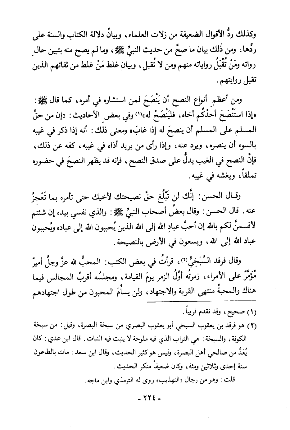 وَكَذَلِكَ رَدُّ الْأَقْوَالِ الضَّعِيفَةِ مِنْ زَلَّاتِ الْعُلَمَاءِ، وَبَيَانُ دَلَالَةِ الْكِتَابِ وَالسُّنَّةِ عَلَى رَدِّهَا، وَمِنْ ذَلِكَ بَيَانُ مَا صَحَّ مِنْ حَدِيثِ النَّبِيِّ صَلَّى اللَّهُ عَلَيْهِ وَسَلَّمَ، وَمَا لَمْ يَصِحَّ مِنْهُ بِتَبْيِينِ حَالِ رُوَاتِهِ وَمَنْ تُقْبَلُ رِوَايَاتُهُ مِنْهُمْ وَمَنْ لَا تُقْبَلُ، وَبَيَانُ غَلَطِ مَنْ غَلَطَ مِنْ ثِقَاتِهِمُ الَّذِينَ تُقْبَلُ رِوَايَتُهُمْ. وَمِنْ أَعْظَمِ أَنْوَاعِ النُّصْحِ أَنْ يَنْصَحَ لِمَنِ اسْتَشَارَهُ فِي أَمْرِهِ، كَمَا قَالَ صَلَّى اللَّهُ عَلَيْهِ وَسَلَّمَ: «إِذَا اسْتَنْصَحَ أَحَدُكُمْ أَخَاهُ، فَلْيَنْصَحْ لَهُ» وَفِي بَعْضِ الْأَحَادِيثِ: «إِنَّ مِنْ حَقِّ الْمُسْلِمِ عَلَى الْمُسْلِمِ أَنْ يَنْصَحَ لَهُ إِذَا غَابَ» وَمَعْنَى ذَلِكَ: أَنَّهُ إِذَا ذُكِرَ فِي غَيْبِهِ بِالسُّوءِ أَنْ يَنْصُرَهُ، وَيَرُدَّ عَنْهُ، وَإِذَا رَأَى مَنْ يُرِيدُ أَذَاهُ فِي غَيْبِهِ، كَفَّهُ عَنْ ذَلِكَ، فَإِنَّ النُّصْحَ فِي الْغَيْبِ يَدُلُّ عَلَى صِدْقِ النُّصْحِ، فَإِنَّهُ قَدْ يَظْهَرُ النُّصْحُ فِي حُضُورِهِ تَمَلُّقًا، وَيَغُشُّهُ فِي غَيْبِهِ. وَقَالَ الْحَسَنُ: إِنَّكَ لَنْ تَبْلُغَ حَقَّ نَصِيحَتِكَ لِأَخِيكَ حَتَّى تَأْمُرَهُ بِمَا تَعْجِزُ عَنْهُ. قَالَ الْحَسَنُ: وَقَالَ بَعْضُ أَصْحَابِ النَّبِيِّ صَلَّى اللَّهُ عَلَيْهِ وَسَلَّمَ: وَالَّذِي نَفْسِي بِيَدِهِ إِنْ شِئْتُمْ لَأُقْسِمَنَّ لَكُمْ بِاللَّهِ إِنَّ أَحَبَّ عِبَادِ اللَّهِ إِلَى اللَّهِ الَّذِينَ يُحَبِّبُونَ اللَّهَ إِلَى عِبَادِهِ وَيُحَبِّبُونَ عِبَادَ اللَّهِ إِلَى اللَّهِ وَيَسْعَوْنَ فِي الْأَرْضِ بِالنَّصِيحَةِ. وَقَالَ فَرْقَدٌ السَّبْخِيُّ، قَرَأْتُ فِي بَعْضِ الْكُتُبِ: الْمُحِبُّ لِلَّهِ عَزَّ وَجَلَّ أَمِيرٌ مُؤَمَّرٌ عَلَى الْأُمَرَاءِ، زُمْرَتُهُ أَوَّلُ الزُّمَرِ يَوْمَ الْقِيَامَةِ، وَمَجْلِسُهُ أَقْرَبُ الْمَجَالِسِ فِيمَا هُنَاكَ وَالْمَحَبَّةُ فِيمَا هُنَاكَ وَالْمَحَبَّةُ مُنْتَهَى الْقُرْبَةِ وَالِاجْتِهَادِ، وَلَنْ يَسْأَمَ الْمُحِبُّونَ مِنْ طُولِ اجْتِهَادِهِمْ