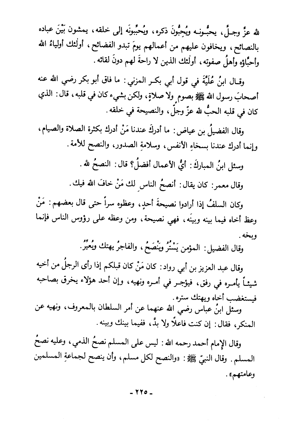 لِلَّهِ عَزَّ وَجَلَّ، يُحِبُّونَهُ وَيُحِبُّونَ ذِكْرَهُ، وَيُحَبِّبُونَ إِلَى خَلْقِهِ، يَمْشُونَ بَيْنَ عِبَادِهِ بِالنَّصَائِحِ، وَيَخَافُونَ عَلَيْهِمْ مِنْ أَعْمَالِهِمْ يَوْمَ تَبْدُو الْفَضَائِحُ، أُولَئِكَ أَوْلِيَاءُ اللَّهِ وَأَحِبَّاؤُهُ وَأَهْلُ صَفْوَتِهِ، أُولَئِكَ الَّذِينَ لَا رَاحَةَ لَهُمْ دُونَ لِقَائِهِ. وَقَالَ ابْنُ عُلَيَّةَ فِي قَوْلِ أَبِي بَكْرٍ الْمُزَنِيِّ: مَا فَاقَ أَبُو بَكْرٍ رَضِيَ اللَّهُ عَنْهُ أَصْحَابَ رَسُولِ اللَّهِ صَلَّى اللَّهُ عَلَيْهِ وَسَلَّمَ بِصَوْمٍ وَلَا صَلَاةٍ، وَلَكِنْ بِشَيْءٍ كَانَ فِي قَلْبِهِ، قَالَ: الَّذِي كَانَ فِي قَلْبِهِ الْحُبُّ لِلَّهِ عَزَّ وَجَلَّ، وَالنَّصِيحَةُ فِي خَلْقِهِ. وَقَالَ الْفُضَيْلُ بْنُ عِيَاضٍ: مَا أَدْرَكَ عِنْدَنَا مَنْ أَدْرَكَ بِكَثْرَةِ الصَّلَاةِ وَالصِّيَامِ، وَإِنَّمَا أَدْرَكَ عِنْدَنَا بِسَخَاءِ الْأَنْفُسِ، وَسَلَامَةِ الصُّدُورِ، وَالنُّصْحِ لِلْأُمَّةِ. وَسُئِلَ ابْنُ الْمُبَارَكِ: أَيُّ الْأَعْمَالِ أَفْضَلُ؟ قَالَ: النُّصْحُ لِلَّهِ. وَقَالَ مَعْمَرٌ: كَانَ يُقَالُ: أَنْصَحُ النَّاسِ لَكَ مَنْ خَافَ اللَّهَ فِيكَ. وَكَانَ السَّلَفُ إِذَا أَرَادُوا نَصِيحَةَ أَحَدٍ، وَعَظُوهُ سِرًّا حَتَّى قَالَ بَعْضُهُمْ: مَنْ وَعَظَ أَخَاهُ فِيمَا بَيْنَهُ وَبَيْنَهُ، فَهِيَ نَصِيحَةٌ، وَمَنْ وَعَظَهُ عَلَى رُؤُوسِ النَّاسِ فَإِنَّمَا وَبَّخَهُ. وَقَالَ الْفُضَيْلُ: الْمُؤْمِنُ يَسْتُرُ وَيَنْصَحُ، وَالْفَاجِرُ يَهْتِكُ وَيُعَيِّرُ. وَقَالَ عَبْدُ الْعَزِيزِ بْنُ أَبِي رَوَّادٍ: كَانَ مَنْ كَانَ قَبْلَكُمْ إِذَا رَأَى الرَّجُلُ مِنْ أَخِيهِ شَيْئًا يَأْمُرُهُ فِي رِفْقٍ، فَيُؤْجَرُ فِي أَمْرِهِ وَنَهْيِهِ، وَإِنَّ أَحَدَ هَؤُلَاءِ يَخْرِقُ بِصَاحِبِهِ فَيَسْتَغْضِبُ أَخَاهُ وَيَهْتِكُ سِتْرَهُ. وَسُئِلَ ابْنُ عَبَّاسٍ رَضِيَ اللَّهُ عَنْهُمَا، عَنْ أَمْرِ السُّلْطَانِ بِالْمَعْرُوفِ، وَنَهْيِهِ عَنِ الْمُنْكَرِ، فَقَالَ: إِنْ كُنْتَ فَاعِلًا وَلَابُدَّ، فَفِيمَا بَيْنَكَ وَبَيْنَهُ. وَقَالَ الْإِمَامُ أَحْمَدُ رَحِمَهُ اللَّهُ: لَيْسَ عَلَى الْمُسْلِمِ نُصْحُ الذِّمِّيِّ، وَعَلَيْهِ نُصْحُ الْمُسْلِمِ، وَقَالَ النَّبِيُّ صَلَّى اللَّهُ عَلَيْهِ وَسَلَّمَ: «وَالنُّصْحُ لِكُلِّ مُسْلِمٍ، وَأَنْ يَنْصَحَ لِجَمَاعَةِ الْمُسْلِمِينَ وَعَامَّتِهِمْ» .