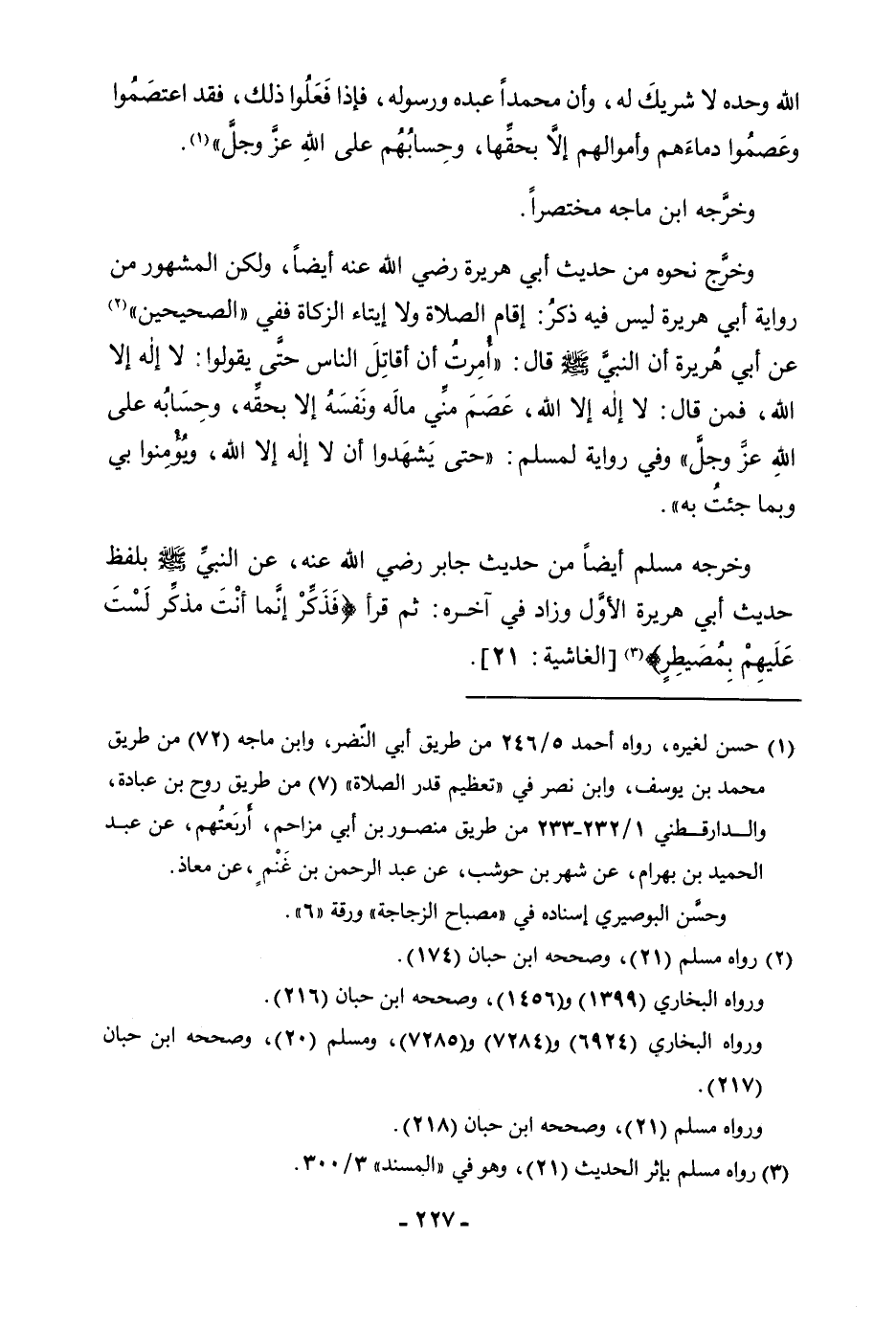 اللَّهُ وَحْدَهُ لَا شَرِيكَ لَهُ، وَأَنَّ مُحَمَّدًا عَبْدُهُ وَرَسُولُهُ، فَإِذَا فَعَلُوا ذَلِكَ، فَقَدِ اعْتَصَمُوا وَعَصَمُوا دِمَاءَهُمْ وَأَمْوَالَهُمْ إِلَّا بِحَقِّهَا، وَحِسَابُهُمْ عَلَى اللَّهِ عَزَّ وَجَلَّ» . وَخَرَّجَهُ ابْنُ مَاجَهْ مُخْتَصَرًا. وَخَرَّجَ نَحْوَهُ مِنْ حَدِيثِ أَبِي هُرَيْرَةَ رَضِيَ اللَّهُ عَنْهُ أَيْضًا، وَلَكِنَّ الْمَشْهُورَ مِنْ رِوَايَةِ أَبِي هُرَيْرَةَ لَيْسَ فِيهِ ذِكْرُ: إِقَامِ الصَّلَاةِ وَلَا إِيتَاءِ الزَّكَاةِ فَفِي " الصَّحِيحَيْنِ " عَنْ أَبِي هُرَيْرَةَ أَنَّ النَّبِيَّ صَلَّى اللَّهُ عَلَيْهِ وَسَلَّمَ قَالَ: «أُمِرْتُ أَنْ أُقَاتِلَ النَّاسَ حَتَّى يَقُولُوا: لَا إِلَهَ إِلَّا اللَّهُ، فَمَنْ قَالَ: لَا إِلَهَ إِلَّا اللَّهُ، عَصَمَ مِنِّي مَالَهُ وَنَفْسَهُ إِلَّا بِحَقِّهِ، وَحِسَابُهُ عَلَى اللَّهِ عَزَّ وَجَلَّ وَفِي رِوَايَةٍ لِمُسْلِمٍ: حَتَّى يَشْهَدُوا أَنْ لَا إِلَهَ إِلَّا اللَّهُ، وَيُؤْمِنُوا بِي وَبِمَا جِئْتُ بِهِ» . وَخَرَجَّهُ مُسْلِمٌ أَيْضًا مِنْ حَدِيثِ جَابِرٍ رَضِيَ اللَّهُ عَنْهُ عَنِ النَّبِيِّ صَلَّى اللَّهُ عَلَيْهِ وَسَلَّمَ بِلَفْظِ حَدِيثِ أَبِي هُرَيْرَةَ الْأَوَّلِ وَزَادَ فِي آخِرِهِ: ثُمَّ قَرَأَ {فَذَكِّرْ إِنَّمَا أَنْتَ مُذَكِّرٌ لَسْتَ عَلَيْهِمْ بِمُسَيْطِرٍ} [الغاشية: 21] (الْغَاشِيَةِ: 21) .