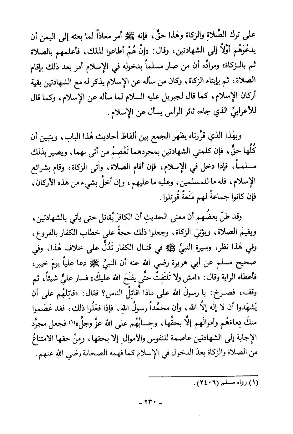 عَلَى تَرْكِ الصَّلَاةِ وَالزَّكَاةِ وَهَذَا حَقٌّ، فَإِنَّهُ صَلَّى اللَّهُ عَلَيْهِ وَسَلَّمَ «أَمَرَ مُعَاذًا لَمَّا بَعَثَهُ إِلَى الْيَمَنِ أَنْ يَدْعُوَهُمْ أَوَّلًا إِلَى الشَّهَادَتَيْنِ، وَقَالَ: إِنْ هُمْ أَطَاعُوكَ لِذَلِكَ، فَأَعْلِمْهُمْ بِالصَّلَاةِ ثُمَّ بِالزَّكَاةِ» وَمُرَادُهُ أَنَّ مَنْ صَارَ مُسْلِمًا بِدُخُولِهِ فِي الْإِسْلَامِ أُمِرَ بَعْدَ ذَلِكَ بِإِقَامِ الصَّلَاةِ، ثُمَّ بِإِيتَاءِ الزَّكَاةِ، وَكَانَ مَنْ سَأَلَهُ عَنِ الْإِسْلَامِ يَذْكُرُ لَهُ مَعَ الشَّهَادَتَيْنِ بَقِيَّةَ أَرْكَانِ الْإِسْلَامِ، كَمَا قَالَ لِجِبْرِيلَ عَلَيْهِ السَّلَامُ لَمَّا سَأَلَهُ عَنِ الْإِسْلَامِ، وَكَمَا قَالَ لِلْأَعْرَابِيِّ الَّذِي جَاءَهُ ثَائِرَ الرَّأْسِ يَسْأَلُهُ عَنِ الْإِسْلَامِ. وَبِهَذَا الَّذِي قَرَّرْنَاهُ يَظْهَرُ الْجَمْعُ بَيْنَ أَلْفَاظِ أَحَادِيثِ هَذَا الْبَابِ، وَيَتَبَيَّنُ أَنَّ كُلَّهَا حَقٌّ، فَإِنَّ كَلِمَتِيِ الشَّهَادَتَيْنِ بِمُجَرَّدِهِمَا تَعْصِمُ مَنْ أَتَى بِهِمَا، وَيَصِيرُ بِذَلِكَ مُسْلِمًا، فَإِذَا دَخَلَ فِي الْإِسْلَامِ، فَإِنْ أَقَامَ الصَّلَاةَ، وَآتَى الزَّكَاةَ، وَقَامَ بِشَرَائِعِ الْإِسْلَامِ، فَلَهُ مَا لِلْمُسْلِمِينَ، وَعَلَيْهِ مَا عَلَيْهِمْ، وَإِنْ أَخَلَّ بِشَيْءٍ مِنْ هَذِهِ الْأَرْكَانِ، فَإِنْ كَانُوا جَمَاعَةً لَهُمْ مَنَعَةً قُوتِلُوا. وَقَدْ ظَنَّ بَعْضُهُمْ أَنَّ مَعْنَى الْحَدِيثِ أَنَّ الْكَافِرَ يُقَاتَلُ حَتَّى يَأْتِيَ بِالشَّهَادَتَيْنِ، وَيُقِيمَ الصَّلَاةَ، وَيُؤْتِيَ الزَّكَاةَ، وَجَعَلُوا ذَلِكَ حُجَّةً عَلَى خِطَابِ الْكُفَّارِ بِالْفُرُوعِ، وَفِي هَذَا نَظَرٌ، وَسِيرَةُ النَّبِيِّ صَلَّى اللَّهُ عَلَيْهِ وَسَلَّمَ فِي قِتَالِ الْكُفَّارِ تَدُلُّ عَلَى خِلَافِ هَذَا، وَفِي " صَحِيحِ مُسْلِمٍ " عَنْ أَبِي هُرَيْرَةَ رَضِيَ اللَّهُ عَنْهُ أَنَّ «النَّبِيَّ صَلَّى اللَّهُ عَلَيْهِ وَسَلَّمَ دَعَا عَلِيًا يَوْمَ خَيْبَرَ، فَأَعْطَاهُ الرَّايَةَ وَقَالَ: امْشِ وَلَا تَلْتَفِتْ حَتَّى يَفْتَحَ اللَّهُ عَلَيْكَ فَسَارَ عَلِيٌّ شَيْئًا، ثُمَّ وَقَفَ، فَصَرَخَ: يَا رَسُولَ اللَّهِ، عَلَى مَاذَا أُقَاتِلُ النَّاسَ؟ فَقَالَ: قَاتِلْهُمْ عَلَى أَنْ يَشْهَدُوا أَنْ لَا إِلَهَ إِلَّا اللَّهُ، وَأَنَّ مُحَمَّدًا رَسُولُ اللَّهِ، فَإِذَا فَعَلُوا ذَلِكَ، فَقَدْ عَصَمُوا مِنْكَ دِمَاءَهُمْ وَأَمْوَالَهُمْ إِلَّا بِحَقِّهَا، وَحِسَابُهُمْ عَلَى اللَّهِ عَزَّ وَجَلَّ» فَجَعَلَ مُجَرَّدَ الْإِجَابَةِ إِلَى الشَّهَادَتَيْنِ عِصْمَةً لِلنُّفُوسِ وَالْأَمْوَالِ إِلَّا بِحَقِّهَا، وَمِنْ حَقِّهَا الِامْتِنَاعُ مِنَ الصَّلَاةِ وَالزَّكَاةِ بَعْدَ الدُّخُولِ فِي الْإِسْلَامِ كَمَا فَهِمَهُ الصَّحَابَةُ رَضِيَ اللَّهُ عَنْهُمْ.