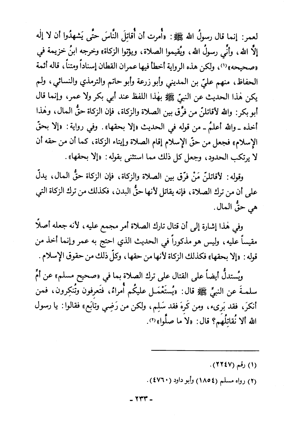 لِعُمَرَ: إِنَّمَا قَالَ رَسُولُ اللَّهِ صَلَّى اللَّهُ عَلَيْهِ وَسَلَّمَ: أُمِرْتُ أَنْ أُقَاتِلَ النَّاسَ حَتَّى يَشْهَدُوا أَنْ لَا إِلَهَ إِلَّا اللَّهُ، وَأَنِّي رَسُولُ اللَّهِ، وَيُقِيمُوا الصَّلَاةَ، وَيُؤْتُوا الزَّكَاةَ» وَخَرَّجَهُ ابْنُ خُزَيْمَةَ فِي " صَحِيحِهِ " وَلَكِنَّ هَذِهِ الرِّوَايَةَ أَخْطَأَ فِيهَا عِمْرَانُ الْقَطَّانُ إِسْنَادًا وَمَتْنًا، قَالَهُ أَئِمَّةُ الْحُفَّاظِ، مِنْهُمْ عَلِيُّ بْنُ الْمَدِينِيِّ وَأَبُو زُرْعَةَ وَأَبُو حَاتِمٍ وَالتِّرْمِذِيُّ وَالنَّسَائِيُّ، وَلَمْ يَكُنْ هَذَا الْحَدِيثُ عَنِ النَّبِيِّ صَلَّى اللَّهُ عَلَيْهِ وَسَلَّمَ بِهَذَا اللَّفْظِ عِنْدَ أَبِي بَكْرٍ وَلَا عُمَرَ، وَإِنَّمَا قَالَ أَبُو بَكْرٍ: وَاللَّهِ لَأُقَاتِلَنَّ مَنْ فَرَّقَ بَيْنَ الصَّلَاةِ وَالزَّكَاةِ، فَإِنَّ الزَّكَاةَ حَقُّ الْمَالِ، وَهَذَا أَخَذَهُ - وَاللَّهُ أَعْلَمُ - مِنْ قَوْلِهِ فِي الْحَدِيثِ إِلَّا بِحَقِّهَا وَفِي رِوَايَةٍ: «إِلَّا بِحَقِّ الْإِسْلَامِ» فَجَعَلَ مِنْ حَقِّ الْإِسْلَامِ إِقَامَ الصَّلَاةِ وَإِيتَاءَ الزَّكَاةِ، كَمَا أَنَّ مِنْ حَقِّهِ أَنْ لَا يَرْتَكِبَ الْحُدُودَ، وَجَعَلَ كُلَّ ذَلِكَ مِمَّا اسْتُثْنِيَ بِقَوْلِهِ: إِلَّا بِحَقِّهَا. وَقَوْلُهُ: لَأُقَاتِلَنَّ مَنْ فَرَّقَ بَيْنَ الصَّلَاةِ وَالزَّكَاةِ، فَإِنَّ الزَّكَاةَ حَقُّ الْمَالِ، يَدُلُّ عَلَى أَنَّ مَنْ تَرَكَ الصَّلَاةَ، فَإِنَّهُ يُقَاتَلُ لِأَنَّهَا حَقُّ الْبَدَنِ، فَكَذَلِكَ مَنْ تَرَكَ الزَّكَاةَ الَّتِي هِيَ حَقُّ الْمَالِ. وَفِي هَذَا إِشَارَةٌ إِلَى أَنَّ قِتَالَ تَارِكِ الصَّلَاةِ أَمْرٌ مُجْمَعٌ عَلَيْهِ، لِأَنَّهُ جَعَلَهُ أَصْلًا مَقِيسًا عَلَيْهِ، وَلَيْسَ هُوَ مَذْكُورًا فِي الْحَدِيثِ الَّذِي احْتَجَّ بِهِ عُمَرُ وَإِنَّمَا أَخَذَ مِنْ قَوْلِهِ: " إِلَّا بِحَقِّهَا " فَكَذَلِكَ الزَّكَاةُ لِأَنَّهَا مِنْ حَقِّهَا، وَكُلُّ ذَلِكَ مِنْ حُقُوقِ الْإِسْلَامِ. وَيُسْتَدَلُّ أَيْضًا عَلَى الْقِتَالِ عَلَى تَرْكِ الصَّلَاةِ بِمَا فِي " صَحِيحِ مُسْلِمٍ " عَنْ أُمِّ سَلَمَةَ، عَنِ النَّبِيِّ صَلَّى اللَّهُ عَلَيْهِ وَسَلَّمَ قَالَ: «يُسْتَعْمَلُ عَلَيْكُمْ أُمَرَاءُ، فَتَعْرِفُونَ وَتُنْكِرُونَ، فَمَنْ أَنْكَرَ، فَقَدْ بَرِئَ، وَمَنْ كَرِهَ فَقَدْ سَلِمَ، وَلَكِنْ مَنْ رَضِيَ وَتَابَعَ فَقَالُوا: يَا رَسُولَ اللَّهِ، أَلَا نُقَاتِلُهُمْ؟ قَالَ لَا مَا صَلَّوْا» .