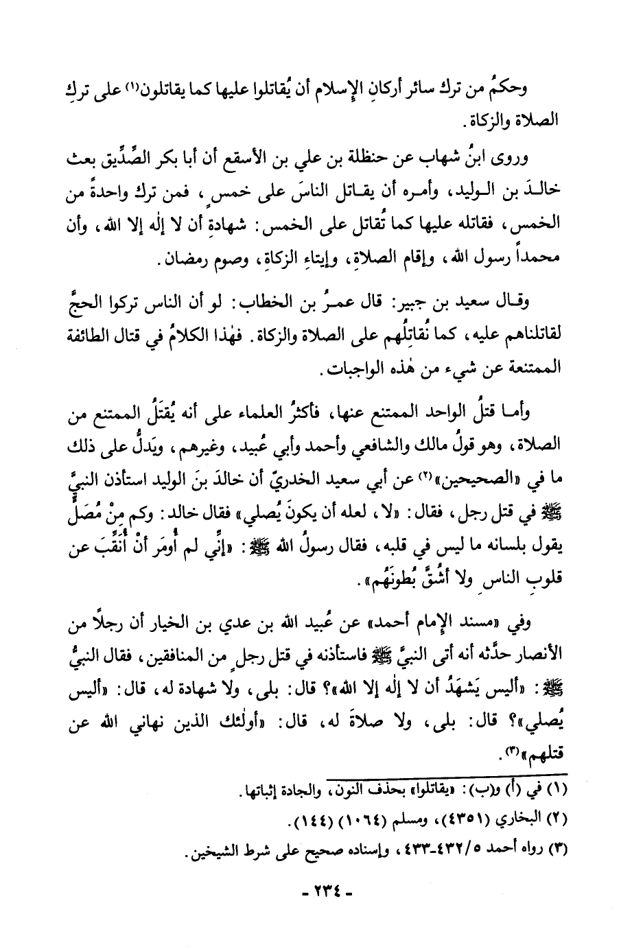وَحُكْمُ مَنْ تَرَكَ سَائِرَ أَرْكَانِ الْإِسْلَامِ أَنْ يُقَاتَلُوا عَلَيْهَا كَمَا يُقَاتَلُونَ عَلَى تَرْكِ الصَّلَاةِ وَالزَّكَاةِ. وَرَوَى ابْنُ شِهَابٍ عَنْ حَنْظَلَةَ بْنِ عَلِيٍّ الْأَسْقَعِ أَنَّ أَبَا بَكْرٍ الصِّدِّيقَ بَعَثَ خَالِدَ بْنَ الْوَلِيدِ، وَأَمَرَهُ أَنْ يُقَاتِلَ النَّاسَ عَلَى خَمْسٍ، فَمَنْ تَرَكَ وَاحِدَةً مِنَ الْخَمْسِ، فَقَاتِلْهُ عَلَيْهَا كَمَا تُقَاتِلُ عَلَى الْخَمْسِ: شَهَادَةِ أَنْ لَا إِلَهَ إِلَّا اللَّهُ، وَأَنَّ مُحَمَّدًا رَسُولُ اللَّهِ، وَإِقَامُ الصَّلَاةِ، وَإِيتَاءُ الزَّكَاةِ، وَصَوْمُ رَمَضَانَ. وَقَالَ سَعِيدُ بْنُ جُبَيْرٍ: قَالَ عُمَرُ بْنُ الْخَطَّابِ: لَوْ أَنَّ النَّاسَ تَرَكُوا الْحَجَّ لَقَاتَلْنَاهُمْ عَلَيْهِ، كَمَا نُقَاتِلُهُمْ عَلَى الصَّلَاةِ وَالزَّكَاةِ. فَهَذَا الْكَلَامُ فِي قِتَالِ الطَّائِفَةِ الْمُمْتَنِعَةِ عَنْ شَيْءٍ مِنْ هَذِهِ الْوَاجِبَاتِ. وَأَمَّا قَتْلُ الْوَاحِدِ الْمُمْتَنِعِ عَنْهَا، فَأَكْثَرُ الْعُلَمَاءِ عَلَى أَنَّهُ يُقْتَلُ الْمُمْتَنِعُ عَنِ الصَّلَاةِ، وَهُوَ قَوْلُ مَالِكٍ وَالشَّافِعِيِّ وَأَحْمَدَ وَأَبِي عُبَيْدٍ، وَغَيْرِهِمْ، وَيَدُلُّ عَلَى ذَلِكَ مَا فِي " الصَّحِيحَيْنِ " عَنْ أَبِي سَعِيدٍ الْخُدْرِيِّ «أَنَّ خَالِدَ بْنَ الْوَلِيدِ اسْتَأْذَنَ النَّبِيَّ صَلَّى اللَّهُ عَلَيْهِ وَسَلَّمَ فِي قَتْلِ رَجُلٍ، فَقَالَ: " لَا، لَعَلَّهُ أَنْ يَكُونَ يُصَلِّي " فَقَالَ خَالِدٌ: وَكَمْ مِنْ مُصَلٍّ يَقُولُ بِلِسَانِهِ مَا لَيْسَ فِي قَلْبِهِ، فَقَالَ رَسُولُ اللَّهِ صَلَّى اللَّهُ عَلَيْهِ وَسَلَّمَ: إِنَّى لَمْ أُومَرْ أَنْ أُنَقِّبَ عَنْ قُلُوبِ النَّاسِ وَلَا أَشُقَّ بُطُونَهُمْ» . وَفِي " مُسْنَدِ الْإِمَامِ أَحْمَدَ " عَنْ عُبَيْدِ اللَّهِ بْنِ عَدِيِّ بْنِ الْخِيَارِ «أَنَّ رَجُلًا مِنَ الْأَنْصَارِ حَدَّثَهُ أَنَّهُ أَتَى النَّبِيَّ صَلَّى اللَّهُ عَلَيْهِ وَسَلَّمَ فَاسْتَأْذَنَهُ فِي قَتْلِ رَجُلٍ مِنَ الْمُنَافِقِينَ، فَقَالَ النَّبِيُّ صَلَّى اللَّهُ عَلَيْهِ وَسَلَّمَ: أَلَيْسَ يَشْهَدُ أَنْ لَا إِلَهَ إِلَّا اللَّهُ؟ قَالَ: بَلَى، وَلَا شَهَادَةَ لَهُ، قَالَ: أَلَيْسَ يُصَلِّي؟ قَالَ: بَلَى، وَلَا صَلَاةَ لَهُ، قَالَ: أُولَئِكَ الَّذِينَ نَهَانِي اللَّهُ، عَنْ قَتْلِهِمْ» .