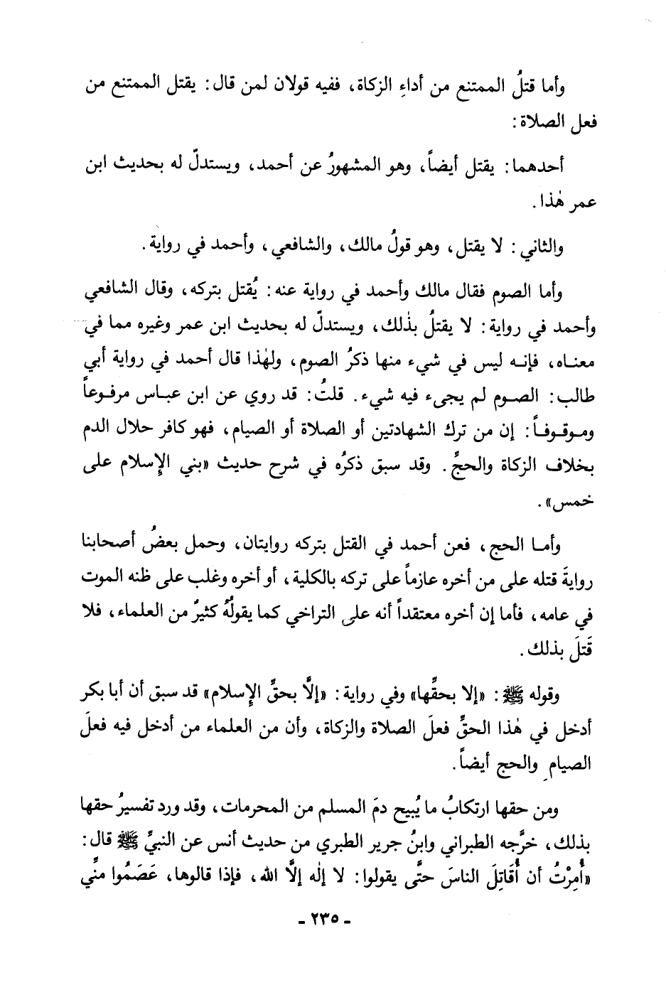 وَأَمَّا قَتْلُ الْمُمْتَنِعِ عَنْ أَدَاءِ الزَّكَاةِ، فَفِيهِ قَوْلَانِ لِمَنْ قَالَ: يُقْتَلُ الْمُمْتَنِعُ مِنْ فِعْلِ الصَّلَاةِ. أَحَدُهُمَا: يُقْتَلُ أَيْضًا، وَهُوَ الْمَشْهُورُ عَنْ أَحْمَدَ، وَيُسْتَدَّلُّ لَهُ بِحَدِيثِ ابْنِ عُمَرَ هَذَا. وَالثَّانِي: لَا يُقْتَلُ، وَهُوَ قَوْلُ مَالِكٍ، وَالشَّافِعِيِّ، وَأَحْمَدَ فِي رِوَايَةٍ. وَأَمَّا الصَّوْمُ فَقَالَ مَالِكٌ وَأَحْمَدُ فِي رِوَايَةٍ عَنْهُ: يُقْتَلُ بِتَرْكِهِ، وَقَالَ الشَّافِعِيُّ وَأَحْمَدُ فِي رِوَايَةٍ: لَا يُقْتَلُ بِذَلِكَ، وَيُسْتَدَلُّ لَهُ بِحَدِيثِ ابْنِ عُمَرَ وَغَيْرِهِ مِمَّا فِي مَعْنَاهُ فَإِنَّهُ لَيْسَ فِي شَيْءٍ مِنْهَا ذِكْرُ الصَّوْمِ، وَلِهَذَا قَالَ أَحْمَدُ فِي رِوَايَةِ أَبِي طَالِبٍ: الصَّوْمُ وَلَمْ يَجِئْ فِيهِ شَيْءٌ. قُلْتُ: وَقَدْ رُوِيَ عَنِ ابْنِ عَبَّاسٍ مَرْفُوعًا وَمَوْقُوفًا: أَنَّ مَنْ تَرَكَ الشَّهَادَتَيْنِ أَوِ الصَّلَاةَ أَوِ الصِّيَامَ، فَهُوَ كَافِرٌ حَلَالُ الدَّمِ بِخِلَافِ الزَّكَاةِ وَالْحَجِّ. وَقَدْ سَبَقَ ذِكْرُهُ فِي شَرْحِ حَدِيثِ " بُنِيَ الْإِسْلَامُ عَلَى خَمْسٍ ". وَأَمَّا الْحَجُّ، فَعَنْ أَحْمَدَ فِي الْقَتْلِ بِتَرْكِهِ رِوَايَتَانِ، وَحَمَلَ بَعْضُ أَصْحَابِنَا رِوَايَةَ قَتْلِهِ عَلَى مَنْ أَخَّرَهُ عَازِمًا عَلَى تَرْكِهِ، بِالْكُلِّيَّةِ أَوْ أَخَّرَهُ وَغَلَبَ عَلَى ظَنِّهِ الْمَوْتُ فِي عَامِهِ، فَأَمَّا إِنْ أَخَّرَهُ مُعْتَقِدًا أَنَّهُ عَلَى التَّرَاخِي كَمَا يَقُولُهُ كَثِيرٌ مِنَ الْعُلَمَاءِ فَلَا قَتْلَ بِذَلِكَ. وَقَوْلُهُ صَلَّى اللَّهُ عَلَيْهِ وَسَلَّمَ: " إِلَّا بِحَقِّهَا " وَفِي رِوَايَةٍ: " إِلَّا بِحَقِّ الْإِسْلَامِ " قَدْ سَبَقَ أَنَّ أَبَا بَكْرٍ أَدْخَلَ فِي هَذَا الْحَقِّ فِعْلَ الصَّلَاةِ وَالزَّكَاةِ، وَأَنَّ مِنَ الْعُلَمَاءِ مَنْ أَدْخَلَ فِيهِ فِعْلَ الصِّيَامِ وَالْحَجِّ أَيْضًا. وَمِنْ حَقِّهَا ارْتِكَابُ مَا يُبِيحُ دَمَ الْمُسْلِمِ مِنَ الْمُحَرَّمَاتِ، وَقَدْ وَرَدَ تَفْسِيرُ حَقِّهَا بِذَلِكَ، خَرَّجَهُ الطَّبَرَانِيُّ وَابْنُ جَرِيرٍ الطَّبَرِيُّ مِنْ حَدِيثِ أَنَسٍ عَنِ النَّبِيِّ صَلَّى اللَّهُ عَلَيْهِ وَسَلَّمَ قَالَ: «أُمِرْتُ أَنْ أُقَاتِلَ النَّاسَ حَتَّى يَقُولُوا: لَا إِلَهَ إِلَّا اللَّهُ، فَإِذَا قَالُوهَا، عَصَمُوا مِنِّي