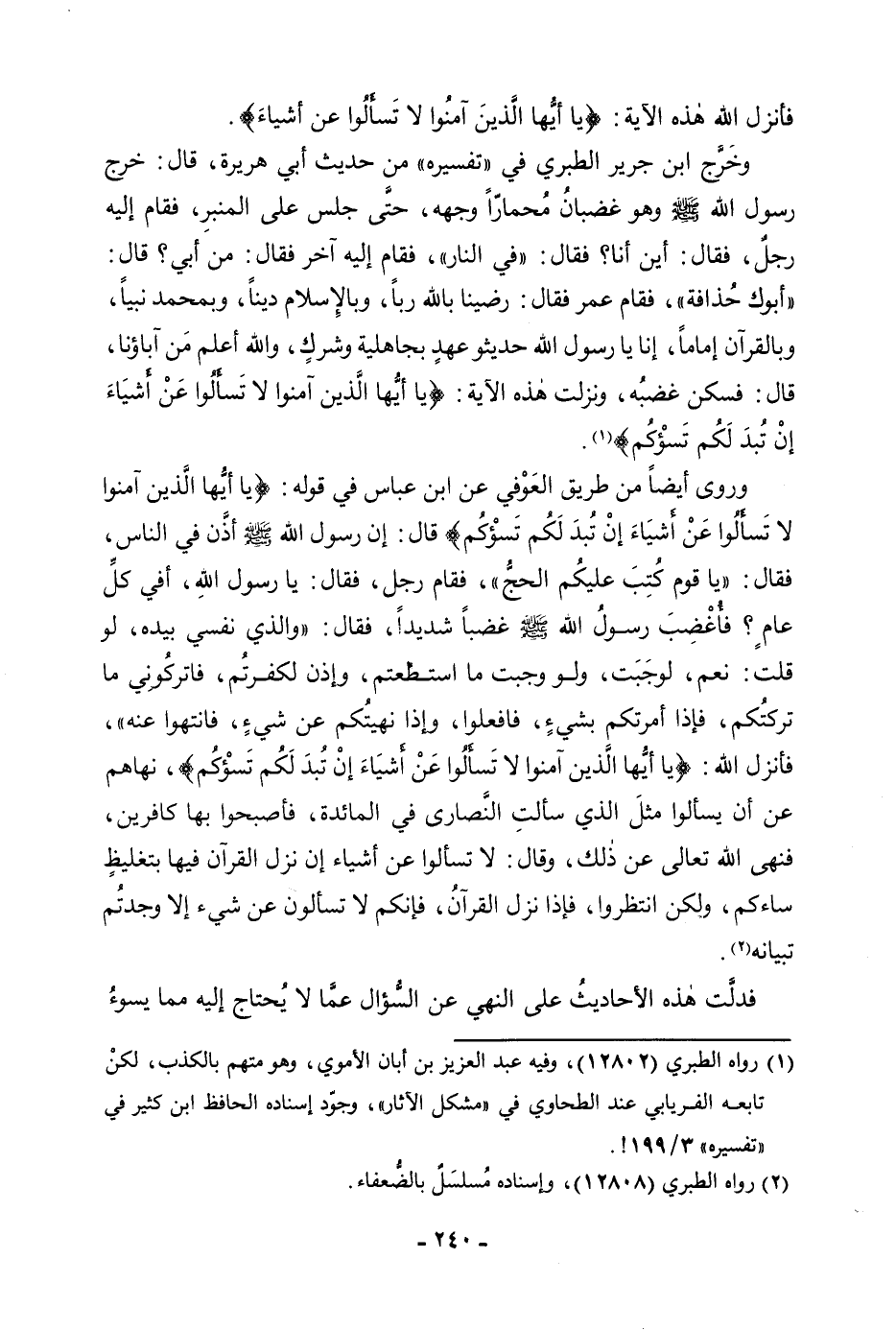 فَأَنْزَلَ اللَّهُ هَذِهِ الْآيَةَ {يَاأَيُّهَا الَّذِينَ آمَنُوا لَا تَسْأَلُوا عَنْ أَشْيَاءَ} [المائدة: 101] . وَخَرَّجَ ابْنُ جَرِيرٍ الطَّبَرِيُّ فِي " تَفْسِيرِهِ " مِنْ حَدِيثِ أَبِي هُرَيْرَةَ، قَالَ: «خَرَجَ رَسُولُ اللَّهِ صَلَّى اللَّهُ عَلَيْهِ وَسَلَّمَ وَهُوَ غَضْبَانُ مُحْمَارًّا وَجْهُهُ، حَتَّى جَلَسَ عَلَى الْمِنْبَرِ، فَقَامَ إِلَيْهِ رَجُلٌ، فَقَالَ: أَيْنَ أَنَا؟ فَقَالَ " فِي النَّارِ " فَقَامَ إِلَيْهِ آخَرُ فَقَالَ: مَنْ أَبِي؟ قَالَ: " أَبُوكَ حُذَافَةُ " فَقَامَ عُمَرُ فَقَالَ: رَضِينَا بِاللَّهِ رَبًّا، وَبِالْإِسْلَامِ دِينًا، وَبِمُحَمَّدٍ نَبِيًّا، وَبِالْقُرْآنِ إِمَامًا، إِنَّا يَا رَسُولَ اللَّهِ حَدِيثُو عَهْدٍ بِجَاهِلِيَّةٍ وَشِرْكٍ، وَاللَّهُ أَعْلَمُ مَنْ آبَاؤُنَا، قَالَ: فَسَكَنَ غَضَبُهُ، وَنَزَلَتْ هَذِهِ الْآيَةُ: {يَاأَيُّهَا الَّذِينَ آمَنُوا لَا تَسْأَلُوا عَنْ أَشْيَاءَ إِنْ تُبْدَ لَكُمْ تَسُؤْكُمْ} [المائدة: 101] » . وَرُوِيَ أَيْضًا مِنْ طَرِيقِ الْعَوْفِيِّ عَنِ ابْنِ عَبَّاسٍ فِي قَوْلِهِ: {يَاأَيُّهَا الَّذِينَ آمَنُوا لَا تَسْأَلُوا عَنْ أَشْيَاءَ إِنْ تُبْدَ لَكُمْ تَسُؤْكُمْ} [المائدة: 101] قَالَ: «إِنَّ رَسُولَ اللَّهِ صَلَّى اللَّهُ عَلَيْهِ وَسَلَّمَ أَذَّنَ فِي النَّاسِ، فَقَالَ: يَا قَوْمُ كُتِبَ عَلَيْكُمُ الْحَجُّ فَقَامَ رَجُلٌ، فَقَالَ يَا رَسُولَ اللَّهِ، أَفِي كُلِّ عَامٍ؟ فَأَغْضَبَ رَسُولَ اللَّهِ صَلَّى اللَّهُ عَلَيْهِ وَسَلَّمَ غَضَبًا شَدِيدًا، فَقَالَ: وَالَّذِي نَفْسِي بِيَدِهِ، لَوْ قُلْتُ: نَعَمْ لَوَجَبَتْ، وَلَوْ وَجَبَتْ مَا اسْتَطَعْتُمْ، وَإِذَنْ لَكَفَرْتُمْ، فَاتْرُكُونِي مَا تَرَكْتُكُمْ، فَإِذَا أَمَرْتُكُمْ بِشَيْءٍ، فَافْعَلُوا، وَإِذَا نَهَيْتُكُمْ عَنْ شَيْءٍ، فَانْتَهُوا عَنْهُ، فَأَنْزَلَ اللَّهُ: {يَاأَيُّهَا الَّذِينَ آمَنُوا لَا تَسْأَلُوا عَنْ أَشْيَاءَ إِنْ تُبْدَ لَكُمْ تَسُؤْكُمْ} [المائدة: 101] » ، نَهَاهُمْ أَنْ يَسْأَلُوا مِثْلَ الَّذِي سَأَلَتِ النَّصَارَى فِي الْمَائِدَةِ، فَأَصْبَحُوا بِهَا كَافِرِينَ، فَنَهَى اللَّهُ تَعَالَى عَنْ ذَلِكَ، وَقَالَ لَا تَسْأَلُوا عَنْ أَشْيَاءَ إِنْ نَزَلَ الْقُرْآنُ فِيهَا بِتَغْلِيظٍ سَاءَكُمْ، وَلَكِنِ انْتَظِرُوا، فَإِذَا نَزَلَ الْقُرْآنُ، فَإِنَّكُمْ لَا تَسْأَلُونَ عَنْ شَيْءٍ إِلَّا وَجَدْتُمْ تِبْيَانَهُ. فَدَلَّتْ هَذِهِ الْأَحَادِيثُ عَلَى النَّهْيِ عَنِ السُّؤَالِ عَمَّا لَا يَحْتَاجُ إِلَيْهِ مَا يَسُوءُ