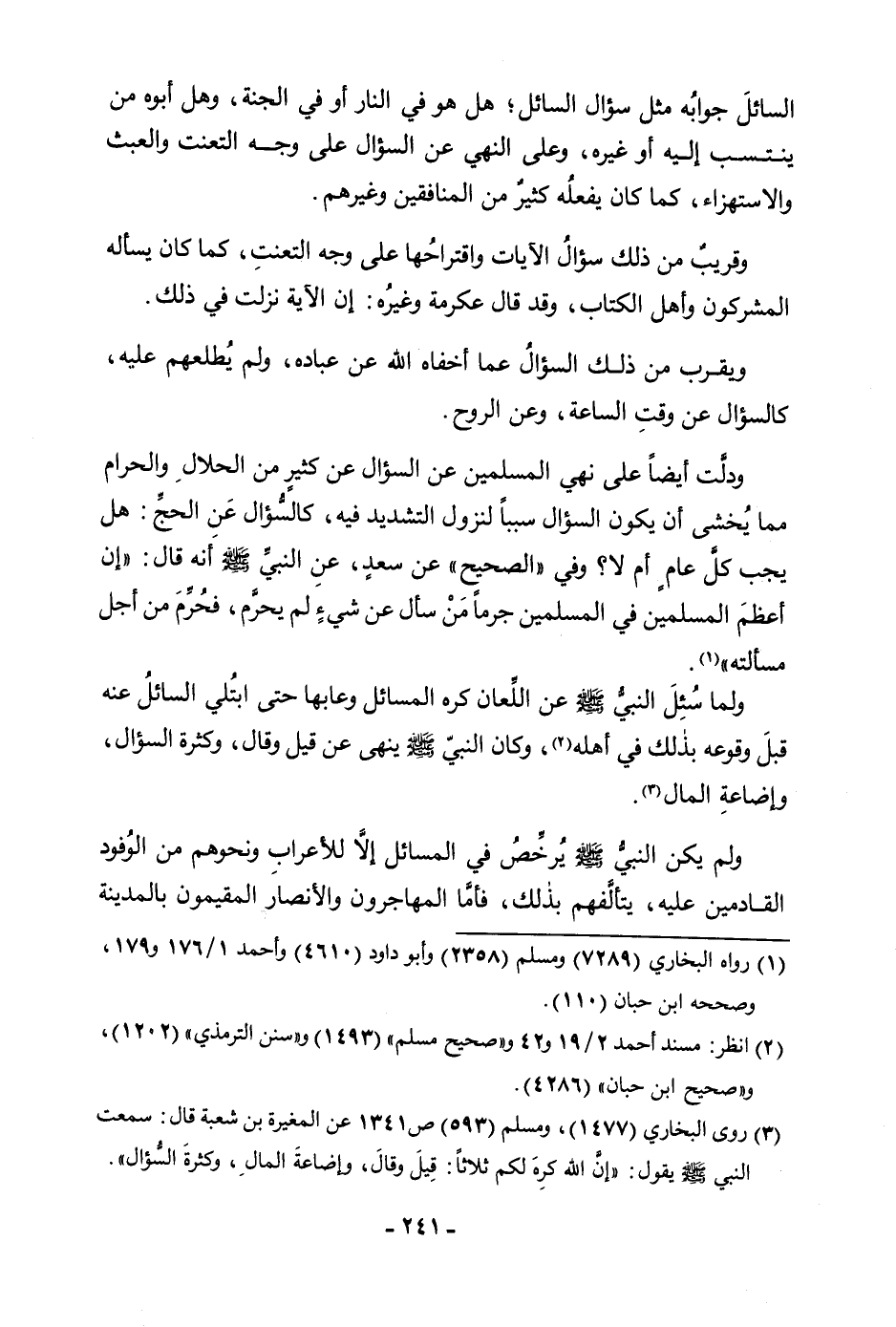 السَّائِلَ جَوَابُهُ مِثْلَ سُؤَالِ السَّائِلِ؛ هَلْ هُوَ فِي النَّارِ أَوْ فِي الْجَنَّةِ، وَهَلْ أَبُوهُ مَا يُنْسَبُ إِلَيْهِ أَوْ غَيْرُهُ، وَعَلَى النَّهْيِ عَنِ السُّؤَالِ عَلَى وَجْهِ التَّعَنُّتِ وَالْعَبَثِ وَالِاسْتِهْزَاءِ، كَمَا كَانَ يَفْعَلُهُ كَثِيرٌ مِنَ الْمُنَافِقِينَ وَغَيْرُهُمْ. وَقَرِيبٌ مِنْ ذَلِكَ سُؤَالُ الْآيَاتِ وَاقْتِرَاحُهَا عَلَى وَجْهِ التَّعَنُّتِ، كَمَا كَانَ يَسْأَلُهُ الْمُشْرِكُونَ وَأَهْلُ الْكِتَابِ، وَقَالَ عِكْرِمَةُ وَغَيْرُهُ: إِنَّ الْآيَةَ نَزَلَتْ فِي ذَلِكَ. وَيَقْرُبُ مِنْ ذَلِكَ السُّؤَالُ عَمَّا أَخْفَاهُ اللَّهُ عَنْ عِبَادِهِ، وَلَمْ يُطْلِعْهُمْ عَلَيْهِ، كَالسُّؤَالِ عَنْ وَقْتِ السَّاعَةِ، وَعَنِ الرُّوحِ. وَدَلَّتْ أَيْضًا عَلَى نَهْيِ الْمُسْلِمِينَ عَنِ السُّؤَالِ عَنْ كَثِيرٍ مِنَ الْحَلَالِ وَالْحَرَامِ مِمَّا يُخْشَى أَنْ يَكُونَ السُّؤَالُ سَبَبًا لِنُزُولِ التَّشْدِيدِ فِيهِ، كَالسُّؤَالِ عَنِ الْحَجِّ: هَلْ يَجِبُ كُلَّ عَامٍ أَمْ لَا؟ وَفِي " الصَّحِيحِ " عَنْ سَعْدٍ عَنِ النَّبِيِّ صَلَّى اللَّهُ عَلَيْهِ وَسَلَّمَ أَنَّهُ قَالَ: «إِنَّ أَعْظَمَ الْمُسْلِمِينَ فِي الْمُسْلِمِينَ جُرْمًا مَنْ سَأَلَ عَنْ شَيْءٍ لَمْ يُحَرَّمْ، فَحُرِّمَ مِنْ أَجْلِ مَسْأَلَتِهِ» . «وَلَمَّا سُئِلَ النَّبِيُّ صَلَّى اللَّهُ عَلَيْهِ وَسَلَّمَ عَنِ اللِّعَانِ كَرِهَ الْمَسَائِلَ وَعَابَهَا حَتَّى ابْتُلِيَ السَّائِلُ عَنْهُ قَبْلَ وُقُوعِهِ بِذَلِكَ فِي أَهْلِهِ» ، «وَكَانَ النَّبِيُّ صَلَّى اللَّهُ عَلَيْهِ وَسَلَّمَ يَنْهَى عَنْ قِيلَ وَقَالَ، وَكَثْرَةِ السُّؤَالِ، وَإِضَاعَةِ الْمَالِ» .