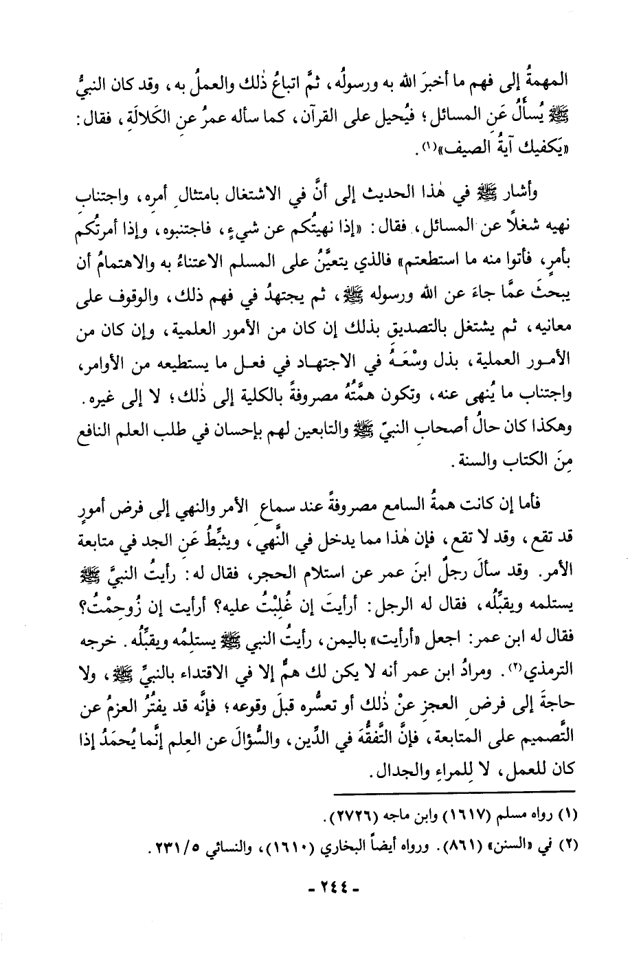 الْمُهِمَّةُ إِلَى فَهْمِ مَا أَخْبَرَ اللَّهُ بِهِ وَرَسُولُهُ، ثُمَّ اتِّبَاعُ ذَلِكَ وَالْعَمَلُ بِهِ، وَقَدْ كَانَ النَّبِيُّ صَلَّى اللَّهُ عَلَيْهِ وَسَلَّمَ يَسْأَلُ عَنِ الْمَسَائِلِ؛ فَيُحِيلُ عَلَى الْقُرْآنِ، كَمَا «سَأَلَهُ عُمَرُ عَنِ الْكَلَالَةِ، " فَقَالَ يَكْفِيكَ آيَةُ الصَّيْفِ» . وَأَشَارَ صَلَّى اللَّهُ عَلَيْهِ وَسَلَّمَ فِي هَذَا الْحَدِيثِ إِلَى أَنَّ فِي الِاشْتِغَالِ بِامْتِثَالِ أَمْرِهِ، وَاجْتِنَابِ نَهْيِهِ شُغْلًا عَنِ الْمَسَائِلِ، «فَقَالَ: إِذَا نَهَيْتُكُمْ عَنْ شَيْءٍ، فَاجْتَنِبُوهُ، وَإِذَا أَمَرْتُكُمْ بِأَمْرٍ، فَأْتُوا مِنْهُ مَا اسْتَطَعْتُمْ» ، فَالَّذِي يَتَعَيَّنُ عَلَى الْمُسْلِمِ الِاعْتِنَاءُ بِهِ وَالِاهْتِمَامُ أَنْ يَبْحَثَ عَمَّا جَاءَ عَنِ اللَّهِ وَرَسُولِهِ صَلَّى اللَّهُ عَلَيْهِ وَسَلَّمَ، ثُمَّ يَجْتَهِدُ فِي فَهْمِ ذَلِكَ، وَالْوُقُوفِ عَلَى مَعَانِيهِ، ثُمَّ يَشْتَغِلُ بِالتَّصْدِيقِ بِذَلِكَ إِنْ كَانَ مِنَ الْأُمُورِ الْعِلْمِيَّةِ، وَإِنْ كَانَ مِنَ الْأُمُورِ الْعَمَلِيَّةِ، بَذَلَ وُسْعَهُ فِي الِاجْتِهَادِ فِي فِعْلِ مَا يَسْتَطِيعُهُ مِنَ الْأَوَامِرِ، وَاجْتِنَابِ مَا يُنْهَى عَنْهُ، وَتَكُونُ هِمَّتُهُ مَصْرُوفَةً بِالْكُلِّيَّةِ إِلَى ذَلِكَ؛ لَا إِلَى غَيْرِهِ. وَهَكَذَا كَانَ حَالُ أَصْحَابِ النَّبِيِّ صَلَّى اللَّهُ عَلَيْهِ وَسَلَّمَ وَالتَّابِعِينَ لَهُمْ بِإِحْسَانٍ فِي طَلَبِ الْعِلْمِ النَّافِعِ مِنَ الْكِتَابِ وَالسُّنَّةِ. فَأَمَّا إِنْ كَانَتْ هِمَّةُ السَّامِعِ مَصْرُوفَةً عِنْدَ سَمَاعِ الْأَمْرِ وَالنَّهْيِ إِلَى فَرْضِ أُمُورٍ قَدْ تَقَعُ، وَقَدْ لَا تَقَعُ، فَإِنَّ هَذَا مِمَّا يَدْخُلُ فِي النَّهْيِ، وَيُثَبِّطُ عَنِ الْجِدِّ فِي مُتَابَعَةِ الْأَمْرِ. وَقَدْ «سَأَلَ رَجُلٌ ابْنَ عُمَرَ عَنِ اسْتِلَامِ الْحَجَرِ، فَقَالَ لَهُ: رَأَيْتُ النَّبِيَّ صَلَّى اللَّهُ عَلَيْهِ وَسَلَّمَ يَسْتَلِمُهُ وَيُقَبِّلُهُ» ، فَقَالَ لَهُ الرَّجُلُ: أَرَأَيْتَ إِنْ غُلِبْتَ عَلَيْهِ؟ أَرَأَيْتَ إِنْ زُوحِمْتَ؟ فَقَالَ لَهُ ابْنُ عُمَرَ: اجْعَلْ " أَرَأَيْتَ " بِالْيَمَنِ، رَأَيْتُ رَسُولَ اللَّهِ يَسْتَلِمُهُ وَيُقَبِّلُهُ خَرَّجَهُ التِّرْمِذِيُّ وَمُرَادُ ابْنِ عُمَرَ أَنْ لَا يَكُونَ لَكَ هَمٌّ إِلَّا فِي الِاقْتِدَاءِ بِالنَّبِيِّ صَلَّى اللَّهُ عَلَيْهِ وَسَلَّمَ، وَلَا حَاجَةَ إِلَّا فَرْضَ الْعَجْزِ عَنْ ذَلِكَ أَوْ تَعَسُّرَهَ قَبْلَ وُقُوعِهِ؛ فَإِنَّهُ قَدْ يَفْتُرُ الْعَزْمُ عَلَى التَّصْمِيمِ عَنِ الْمُتَابَعَةِ، فَإِنَّ التَّفَقُّهَ فِي الدِّينِ، وَالسُّؤَالَ عَنِ الْعِلْمِ إِنَّمَا يُحْمَدُ إِذَا كَانَ لِلْعَمَلِ، لَا لِلْمِرَاءِ وَالْجِدَالِ.