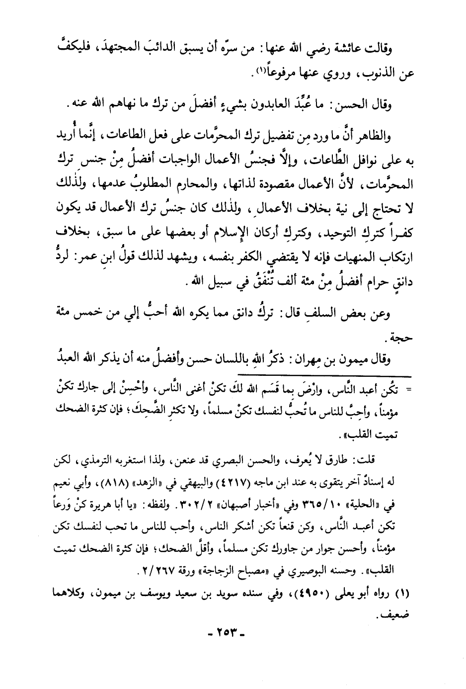 وَالظَّاهِرُ أَنَّ مَا وَرَدَ مِنْ تَفْضِيلِ تَرْكِ الْمُحَرَّمَاتِ عَلَى فِعْلِ الطَّاعَاتِ، إِنَّمَا أُرِيدَ بِهِ عَلَى نَوَافِلِ الطَّاعَاتِ، وَإِلَّا فَجِنْسُ الْأَعْمَالِ الْوَاجِبَاتِ أَفْضَلُ مِنْ جِنْسِ تَرْكِ الْمُحَرَّمَاتِ، لِأَنَّ الْأَعْمَالَ مَقْصُودَةٌ لِذَاتِهَا، وَالْمَحَارِمَ الْمَطْلُوبُ عَدَمُهَا، وَلِذَلِكَ لَا تَحْتَاجُ إِلَى نِيَّةٍ بِخِلَافِ الْأَعْمَالِ، وَلِذَلِكَ كَانَ جِنْسُ تَرْكِ الْأَعْمَالِ قَدْ تَكُونُ كُفْرًا كَتَرْكِ التَّوْحِيدِ، وَكَتَرْكِ أَرْكَانِ الْإِسْلَامِ أَوْ بَعْضِهَا عَلَى مَا سَبَقَ، بِخِلَافِ ارْتِكَابِ الْمَنْهِيَّاتِ فَإِنَّهُ لَا يَقْتَضِي الْكُفْرَ بِنَفْسِهِ، وَيَشْهَدُ لِذَلِكَ قَوْلُ ابْنِ عُمَرَ: لَرَدُّ دَانِقٍ مِنْ حَرَامٍ أَفْضَلُ مِنْ مِائَةِ أَلْفٍ تُنْفَقُ فِي سَبِيلِ اللَّهِ. وَعَنْ بَعْضِ السَّلَفِ قَالَ: تَرْكُ دَانَقٍ مِمَّا يَكْرَهُهُ اللَّهُ أَحَبُّ إِلَيَّ مِنْ خَمْسِمِائَةِ حَجَّةٍ. وَقَالَ مَيْمُونُ بْنُ مِهْرَانَ: ذِكْرُ اللَّهِ بِاللِّسَانِ حَسَنٌ وَأَفْضَلُ مِنْهُ أَنْ يَذْكُرَ اللَّهَ الْعَبْدُ