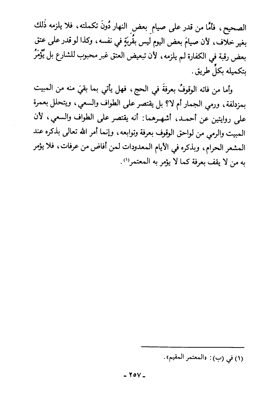 الصَّحِيحِ، فَأَمَّا مَنْ قَدَرَ عَلَى صِيَامِ بَعْضِ النَّهَارِ دُونَ تَكْمِلَتِهِ، فَلَا يَلْزَمُهُ ذَلِكَ بِغَيْرِ خِلَافٍ، لِأَنَّ صِيَامَ بَعْضِ الْيَوْمِ لَيْسَ بِقُرْبَةٍ فِي نَفْسِهِ، وَكَذَا لَوْ قَدَرَ عَلَى عِتْقِ بَعْضِ رَقَبَةٍ فِي الْكَفَّارَةِ لَمْ يَلْزَمْهُ، لَأَنَّ تَبْعِيضَ الْعِتْقِ غَيْرُ مَحْبُوبٍ لِلشَّارِعِ بَلْ يُؤْمَرُ بِتَكْمِيلِهِ بِكُلِّ طَرِيقٍ. وَأَمَّا مَنْ فَاتَهُ الْوُقُوفُ بِعَرَفَةَ فِي الْحَجِّ، فَهَلْ يَأْتِي بِمَا بَقِيَ مِنْهُ مِنَ الْمَبِيتِ بِمُزْدَلِفَةَ، وَرَمْيِ الْجِمَارِ أَمْ لَا؟ بَلْ يَقْتَصِرُ عَلَى الطَّوَافِ وَالسَّعْيِ، وَيَتَحَلَّلُ بِعُمْرَةٍ عَلَى رِوَايَتَيْنِ، عَنْ أَحْمَدَ أَشْهَرُهُمَا: أَنَّهُ يَقْتَصِرُ عَلَى الطَّوَافِ وَالسَّعْيِ، لِأَنَّ الْمَبِيتَ وَالرَّمْيَ مِنْ لَوَاحِقِ الْوُقُوفِ بِعَرَفَةَ وَتَوَابِعِهِ، وَإِنَّمَا أَمَرَ اللَّهُ تَعَالَى بِذِكْرِهِ عِنْدَ الْمَشْعَرِ الْحَرَامِ، وَبِذِكْرِهِ فِي الْأَيَّامِ الْمَعْدُودَاتِ لِمَنْ أَفَاضَ مِنْ عَرَفَاتٍ، فَلَا يُؤْمَرُ بِهِ مَنْ لَا يَقِفُ بِعَرَفَةَ كَمَا لَا يُؤْمَرُ بِهِ الْمُعْتَمِرُ.