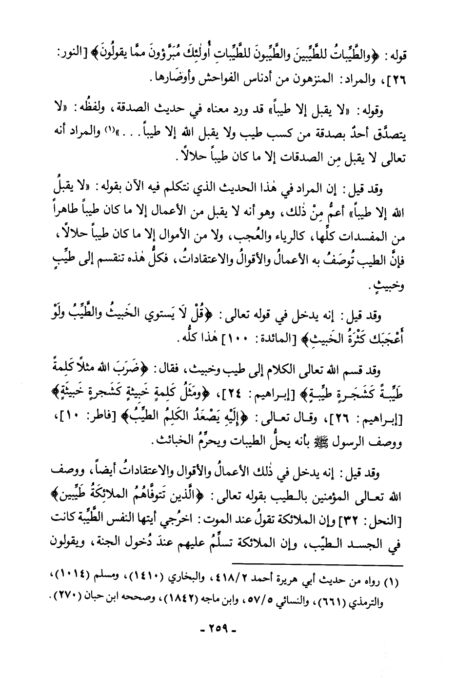 وَقَدْ قِيلَ: إِنَّهُ يَدْخُلُ فِي ذَلِكَ الْأَقْوَالُ وَالْأَعْمَالُ وَالِاعْتِقَادَاتُ أَيْضًا، وَوَصَفَ اللَّهُ تَعَالَى الْمُؤْمِنِينَ بِالطَّيِّبِ، بِقَوْلِهِ تَعَالَى: {الَّذِينَ تَتَوَفَّاهُمُ الْمَلَائِكَةُ طَيِّبِينَ} [النحل: 32] (النَّحْلِ: 32) وَإِنَّ الْمَلَائِكَةَ تَقُولُ عِنْدَ الْمَوْتِ: اخْرُجِي أَيَّتُهَا النَّفْسُ الطَّيِّبَةُ كَانَتْ فِي الْجَسَدِ الطَّيِّبِ، وَإِنَّ الْمَلَائِكَةَ تُسَلِّمُ عَلَيْهِمْ عِنْدَ دُخُولِهِمُ الْجَنَّةَ، يَقُولُونَ