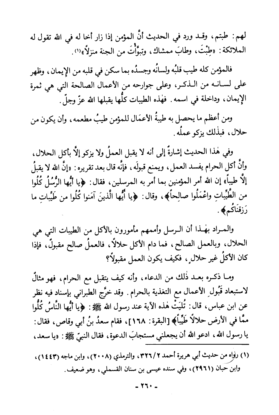 وَمَا ذَكَرَهُ بَعْدَ ذَلِكَ مِنَ الدُّعَاءِ، وَأَنَّهُ كَيْفَ يُتَقَبَّلُ مَعَ الْحَرَامِ، فَهُوَ مِثَالٌ لِاسْتِبْعَادِ قَبُولِ الْأَعْمَالِ مَعَ التَّغْذِيَةِ بِالْحَرَامِ. وَقَدْ خَرَّجَ الطَّبَرَانِيُّ بِإِسْنَادٍ فِيهِ نَظَرٌ عَنِ ابْنِ عَبَّاسٍ، قَالَ: «تُلِيَتْ هَذِهِ الْآيَةُ عِنْدَ رَسُولِ اللَّهِ صَلَّى اللَّهُ عَلَيْهِ وَسَلَّمَ: {يَاأَيُّهَا النَّاسُ كُلُوا مِمَّا فِي الْأَرْضِ حَلَالًا طَيِّبًا} [البقرة: 168] (الْبَقَرَةِ: 168) ، فَقَامَ سَعْدُ بْنُ أَبِي وَقَّاصٍ، فَقَالَ: يَا رَسُولَ اللَّهِ، ادْعُ اللَّهَ أَنْ يَجْعَلَنِي مُسْتَجَابَ الدَّعْوَةِ، فَقَالَ النَّبِيُّ صَلَّى اللَّهُ عَلَيْهِ وَسَلَّمَ: يَا سَعْدُ