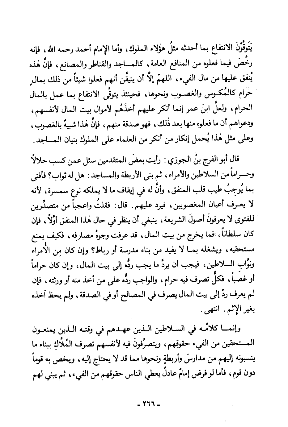 يَتَوَقَّوْنَ الِانْتِفَاعَ بِمَا أَحْدَثَهُ مِثْلُ هَؤُلَاءِ الْمُلُوكِ، وَأَمَّا الْإِمَامُ أَحْمَدُ رَحِمَهُ اللَّهُ، فَإِنَّهُ رَخَّصَ فِيمَا فَعَلُوهُ مِنَ الْمَنَافِعِ الْعَامَّةِ، كَالْمَسَاجِدِ وَالْقَنَاطِرِ وَالْمَصَانِعِ، فَإِنَّ هَذِهِ يُنْفَقُ عَلَيْهَا مِنْ مَالِ الْفَيْءِ، اللَّهُمَّ إِلَّا أَنْ يَتَيَقَّنَ أَنَّهُمْ فَعَلُوا أَشْيَاءَ مِنْ ذَلِكَ بِمَالٍ حَرَامٍ كَالْمُكُوسِ وَالْغُصُوبِ وَنَحْوِهَا، فَحِينَئَذٍ يَتَوَقَّى الِانْتِفَاعَ بِمَا عُمِلَ بِالْمَالِ الْحَرَامِ، وَلَعَلَّ ابْنَ عُمَرَ إِنَّمَا أَنْكَرَ عَلَيْهِمْ أَخْذَهُمْ لِأَمْوَالِ بَيْتِ الْمَالِ لِأَنْفُسِهِمْ، وَدَعْوَاهُمْ أَنَّ مَا فَعَلُوهُ مِنْهَا بَعْدَ ذَلِكَ، فَهُوَ صَدَقَةٌ مِنْهُمْ، فَإِنَّ هَذَا شَبِيهٌ بِالْغُصُوبِ، وَعَلَى مِثْلِ هَذَا يُحْمَلُ إِنْكَارُ مَنْ أَنْكَرَ مِنَ الْعُلَمَاءِ عَلَى الْمُلُوكِ بُنْيَانَ الْمَسَاجِدِ.