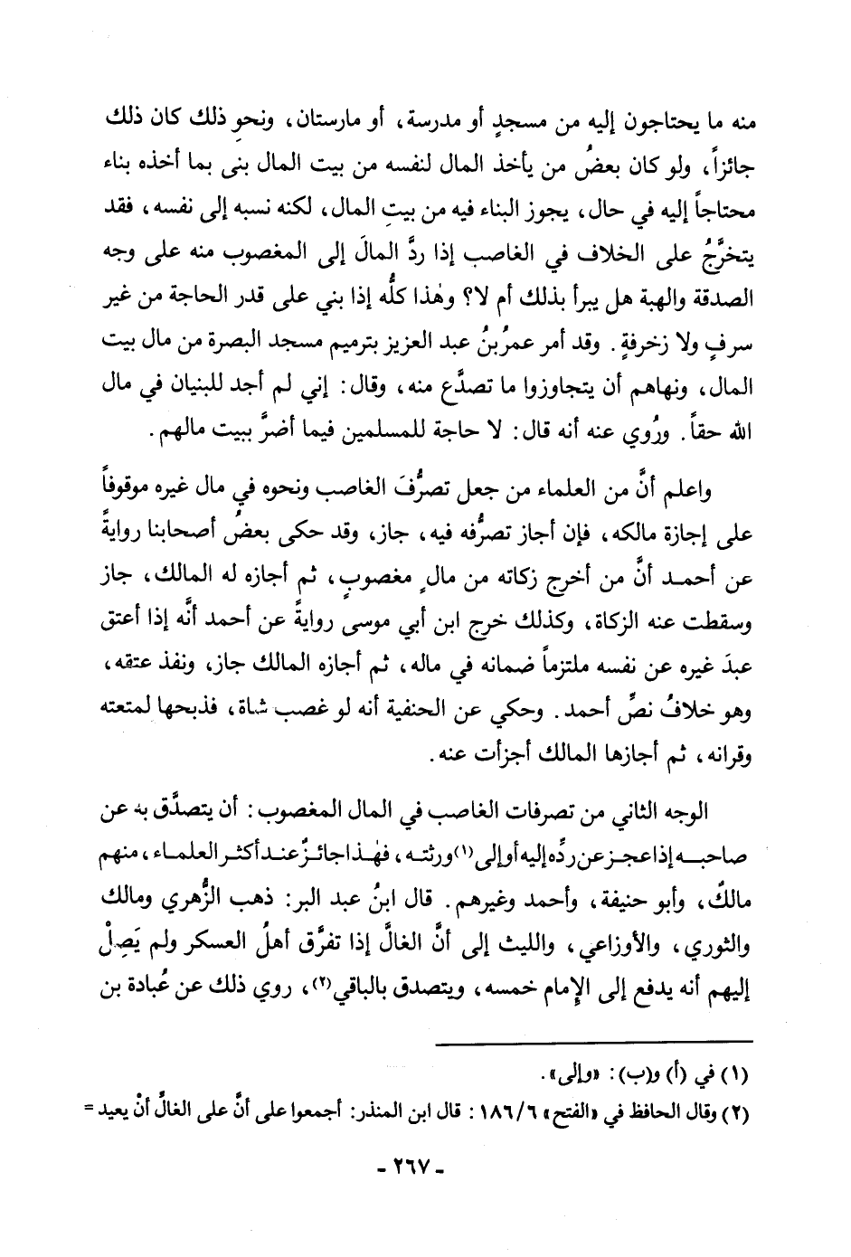 مِنْهُ مَا يَحْتَاجُونَ إِلَيْهِ مِنْ مَسْجِدٍ أَوْ مَدْرَسَةٍ، أَوْ مَارِسْتَانَ، وَنَحْوِ ذَلِكَ كَانَ ذَلِكَ جَائِزًا، وَلَوْ كَانَ بَعْضُ مَنْ يَأْخُذُ الْمَالَ لِنَفْسِهِ مِنْ بَيْتِ الْمَالِ بَنَى بِمَا أَخَذَ مِنْهُ بِنَاءً مُحْتَاجًا إِلَيْهِ فِي حَالٍ، يَجُوزُ الْبِنَاءُ فِيهِ مِنْ بَيْتِ الْمَالِ، لَكِنَّهُ يَنْسُبُهُ إِلَى نَفْسِهِ، فَقَدْ يَتَخَرَّجُ عَلَى الْخِلَافِ فِي الْغَاصِبِ إِذَا رَدَّ الْمَالَ إِلَى الْمَغْصُوبِ مِنْهُ عَلَى وَجْهِ الصَّدَقَةِ وَالْهِبَةِ هَلْ يَبْرَأُ بِذَلِكَ أَمْ لَا؟ وَهَذَا كُلُّهُ إِذَا بَنَى عَلَى قَدْرِ الْحَاجَةِ مِنْ غَيْرِ سَرَفٍ وَلَا زَخْرَفَةٍ. وَقَدْ أَمَرَ عُمَرُ بْنُ عَبْدِ الْعَزِيزِ بِتَرْمِيمِ مَسْجِدِ الْبَصْرَةِ مِنْ بَيْتِ الْمَالِ، وَنَهَاهُمْ أَنْ يَتَجَاوَزُوا مَا تَصَدَّعَ مِنْهُ، وَقَالَ: إِنِّي لَمْ أَجِدْ لِلْبُنْيَانِ فِي مَالِ اللَّهِ حَقًّا. وَرُوِيَ عَنْهُ أَنَّهُ قَالَ: لَا حَاجَةَ لِلْمُسْلِمِينَ فِيمَا أَضَرَّ بَيْتَ مَالِهِمْ.
