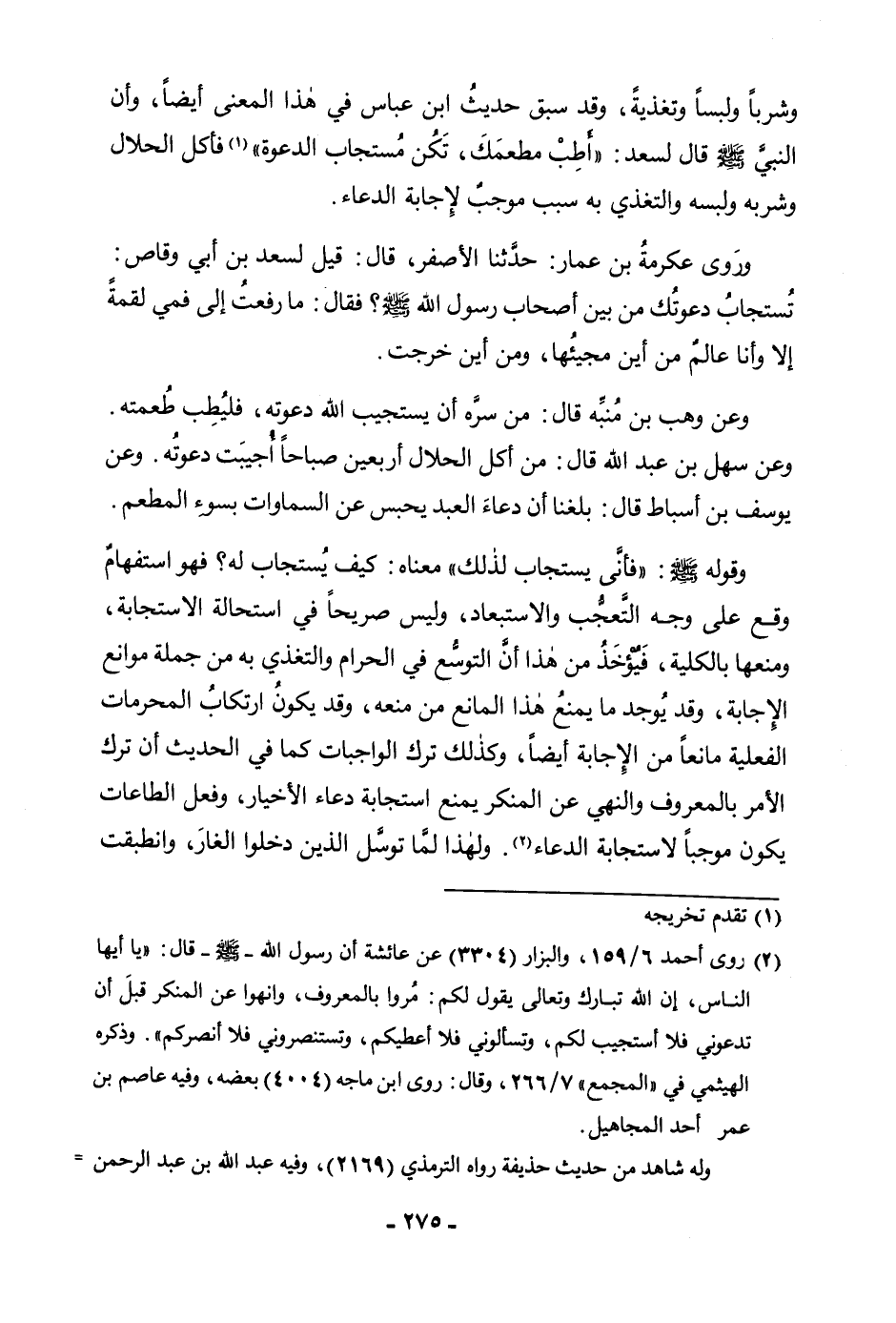 وَشُرْبًا وَلُبْسًا وَتَغْذِيَةً، وَقَدْ سَبَقَ حَدِيثُ ابْنِ عَبَّاسٍ فِي هَذَا الْمَعْنَى أَيْضًا، وَأَنَّ «النَّبِيَّ صَلَّى اللَّهُ عَلَيْهِ وَسَلَّمَ قَالَ لِسَعْدٍ: " أَطِبْ مَطْعَمَكَ، تَكُنْ مُسْتَجَابَ الدَّعْوَةِ» " فَأَكْلُ الْحَلَالِ وَشُرْبُهُ وَلُبْسُهُ وَالتَّغَذِّي بِهِ سَبَبٌ مُوجِبٌ لِإِجَابَةِ الدُّعَاءِ.