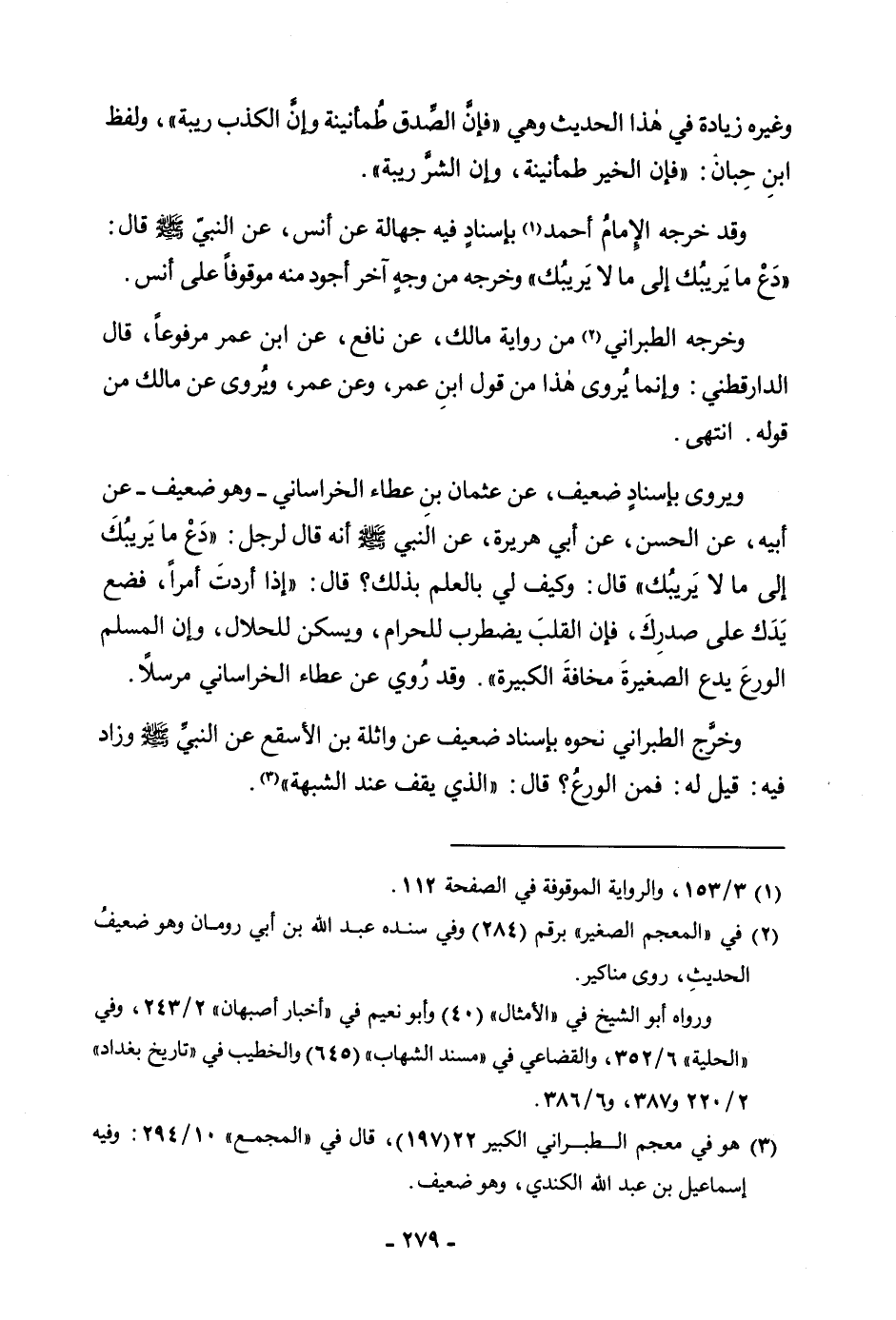 وَيُرْوَى بِإِسْنَادٍ ضَعِيفٍ، عَنْ عُثْمَانَ بْنِ عَطَاءٍ الْخُرَاسَانِيِّ - وَهُوَ ضَعِيفٌ -، عَنْ أَبِيهِ، عَنِ الْحَسَنِ، عَنْ أَبِي هُرَيْرَةَ، عَنِ «النَّبِيِّ صَلَّى اللَّهُ عَلَيْهِ وَسَلَّمَ أَنَّهُ قَالَ لِرَجُلٍ: " دَعْ مَا يَرِيبُكَ إِلَى مَا لَا يَرِيبُكَ " قَالَ: وَكَيْفَ لِي بِالْعِلْمِ بِذَلِكَ؟ قَالَ: " إِذَا أَرَدْتَ أَمْرًا، فَضَعْ يَدَكَ عَلَى صَدْرِكَ، فَإِنَّ الْقَلْبَ يَضْطَرِبُ لِلْحَرَامِ، وَيَسْكُنُ لِلْحَلَالِ، وَإِنَّ الْمُسْلِمَ الْوَرِعَ يَدَعُ الصَّغِيرَةَ مَخَافَةَ الْكَبِيرَةِ» ". وَقَدْ رُوِيَ عَنْ عَطَاءٍ الْخُرَاسَانِيِّ مُرْسَلًا.