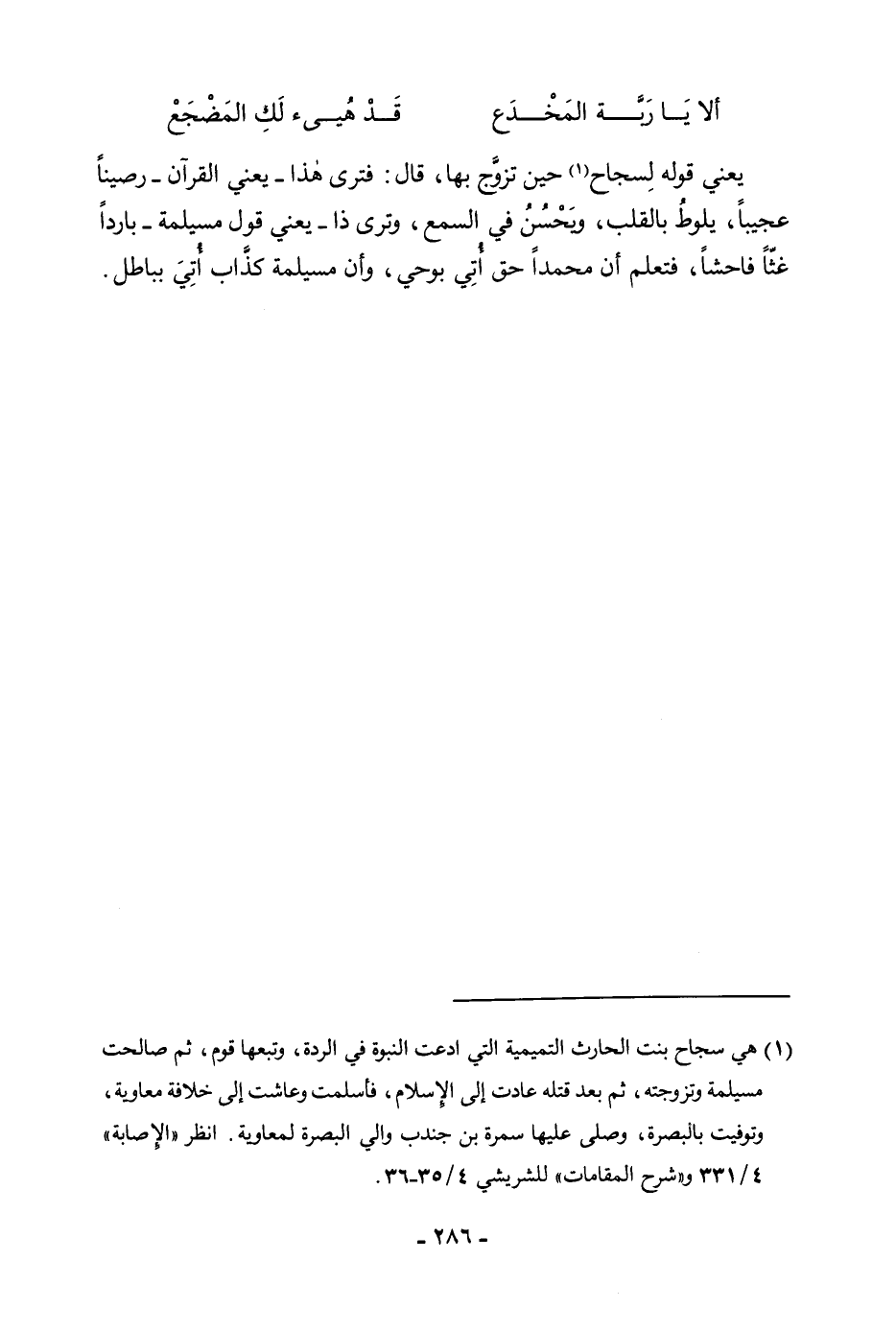 أَلَا يَا رَبَّةَ الْمَخْدَعْ 26 قَدْ هُيِّئَ لَكِ الْمَضْجَعْ يَعْنِي قَوْلَهُ لِسِجَاحَ حِينَ تَزَوَّجَ بِهَا، قَالَ: فَتَرَى هَذَا - يَعْنِي الْقُرْآنَ - رَصِينًا عَجِيبًا، يَلُوطُ بِالْقَلْبِ، وَيَحْسُنُ فِي السَّمْعِ، وَتَرَى ذَا - يَعْنِي قَوْلَ مُسَيْلِمَةَ - بَارِدًا غَثًّا فَاحِشًا، فَتَعْلَمُ أَنَّ مُحَمَّدًا حَقٌّ أُتِيَ بِوَحْيٍ، وَأَنَّ مُسَيْلِمَةَ كَذَّابٌ أُتِيَ بِبَاطِلٍ.