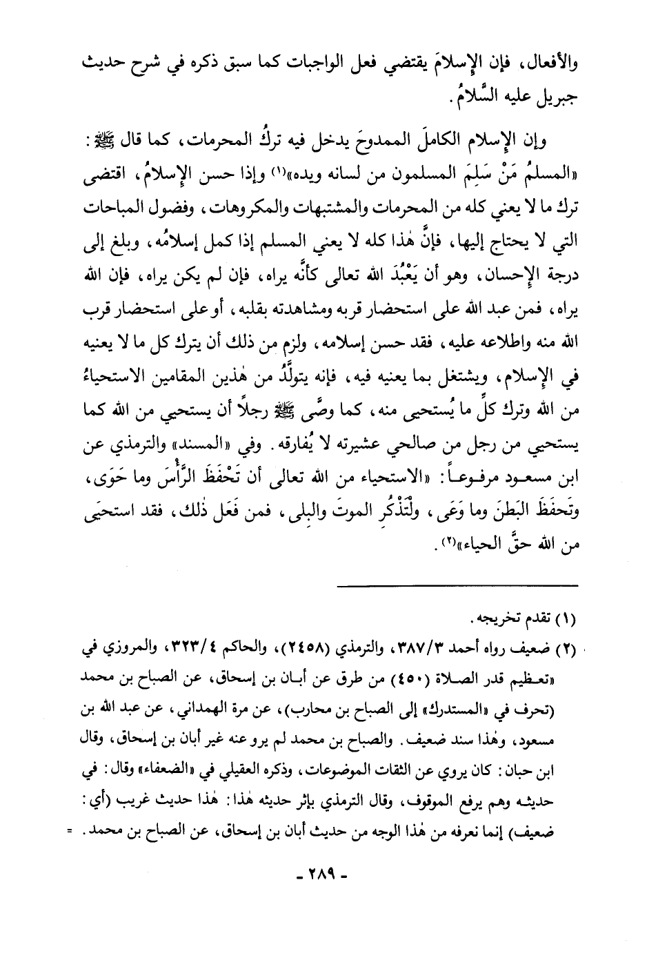 وَإِنَّ الْإِسْلَامَ الْكَامِلَ الْمَمْدُوحَ يَدْخُلُ فِيهِ تَرْكُ الْمُحَرَّمَاتِ، كَمَا قَالَ صَلَّى اللَّهُ عَلَيْهِ وَسَلَّمَ: «الْمُسْلِمُ مَنْ سَلِمَ الْمُسْلِمُونَ مِنْ لِسَانِهِ وَيَدِهِ» وَإِذَا حَسُنَ الْإِسْلَامُ، اقْتَضَى تَرْكَ مَا لَا يَعْنِي كُلَّهُ مِنَ الْمُحَرَّمَاتِ وَالْمُشْتَبِهَاتِ وَالْمَكْرُوهَاتِ، وَفُضُولِ الْمُبَاحَاتِ الَّتِي لَا يَحْتَاجُ إِلَيْهَا، فَإِنَّ هَذَا كُلَّهُ لَا يَعْنِي الْمُسْلِمَ إِذَا كَمُلَ إِسْلَامُهُ، وَبَلَغَ إِلَى دَرَجَةِ الْإِحْسَانِ، وَهُوَ أَنْ يَعْبُدَ اللَّهَ تَعَالَى كَأَنَّهُ يَرَاهُ، فَإِنْ لَمْ يَكُنْ يَرَاهُ، فَإِنَّ اللَّهَ يَرَاهُ، فَمَنْ عَبَدَ اللَّهَ عَلَى اسْتِحْضَارِ قُرْبِهِ وَمُشَاهَدَتِهِ بِقَلْبِهِ، أَوْ عَلَى اسْتِحْضَارِ قُرْبِ اللَّهِ مِنْهُ وَاطِّلَاعِهِ عَلَيْهِ، فَقَدْ حَسُنَ إِسْلَامُهُ، وَلَزِمَ مِنْ ذَلِكَ أَنْ يَتْرُكَ كُلَّ مَا لَا يَعْنِيهِ فِي الْإِسْلَامِ، وَيَشْتَغِلَ بِمَا يَعْنِيهِ فِيهِ، فَإِنَّهُ يَتَوَلَّدُ مِنْ هَذَيْنِ الْمَقَامَيْنِ الِاسْتِحْيَاءُ مِنَ اللَّهِ وَتَرْكُ كُلِّ مَا يُسْتَحْيَا مِنْهُ كَمَا وَصَّى صَلَّى اللَّهُ عَلَيْهِ وَسَلَّمَ رَجُلًا أَنْ يَسْتَحْيِيَ مِنَ اللَّهِ كَمَا يَسْتَحْيِي مِنْ رَجُلٍ مِنْ صَالِحِي عَشِيرَتِهِ لَا يُفَارِقُهُ. وَفِي " الْمُسْنَدِ " وَالتِّرْمِذِيِّ عَنِ ابْنِ مَسْعُودٍ مَرْفُوعًا: " «الِاسْتِحْيَاءُ مِنَ اللَّهِ تَعَالَى أَنْ تَحْفَظَ الرَّأْسَ وَمَا حَوَى، وَتَحْفَظَ الْبَطْنَ وَمَا وَعَى، وَلِتَذْكُرَ الْمَوْتَ وَالْبِلَى، فَمَنْ فَعَلَ ذَلِكَ، فَقَدِ اسْتَحْيَا مِنَ اللَّهِ حَقَّ الْحَيَاءِ» ".