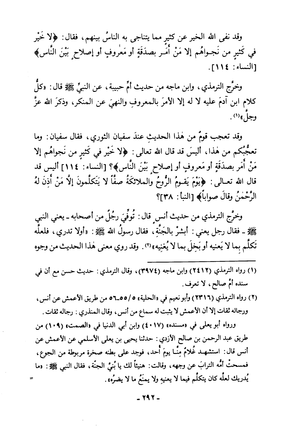 وَقَدْ تَعَجَّبَ قَوْمٌ مِنْ هَذَا الْحَدِيثِ عِنْدَ سُفْيَانَ الثَّوْرِيِّ، فَقَالَ سُفْيَانُ: وَمَا تَعَجُّبُكُمْ مِنْ هَذَا، أَلَيْسَ قَدْ قَالَ اللَّهُ تَعَالَى: {لَا خَيْرَ فِي كَثِيرٍ مِنْ نَجْوَاهُمْ إِلَّا مَنْ أَمَرَ بِصَدَقَةٍ أَوْ مَعْرُوفٍ أَوْ إِصْلَاحٍ بَيْنَ النَّاسِ} [النساء: 114] ؟ (النِّسَاءِ: 114) أَلَيْسَ قَدْ قَالَ اللَّهُ تَعَالَى: {يَوْمَ يَقُومُ الرُّوحُ وَالْمَلَائِكَةُ صَفًّا لَا يَتَكَلَّمُونَ إِلَّا مَنْ أَذِنَ لَهُ الرَّحْمَنُ وَقَالَ صَوَابًا} [النبأ: 38] (النَّبَأِ: 38) .