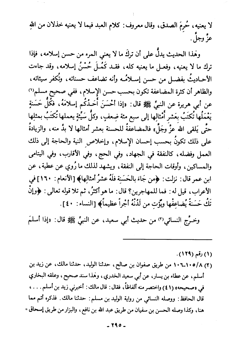 وَهَذَا الْحَدِيثُ يَدُلُّ عَلَى أَنَّ تَرْكَ مَا لَا يَعْنِي الْمَرْءَ مِنْ حُسْنِ إِسْلَامِهِ، فَإِذَا تَرَكَ مَا لَا يَعْنِيهِ، وَفَعَلَ مَا يَعْنِيهِ كُلَّهُ، فَقَدْ كَمُلَ حُسْنُ إِسْلَامِهِ، وَقَدْ جَاءَتِ الْأَحَادِيثُ بِفَضْلِ مَنْ حَسُنَ إِسْلَامُهُ وَأَنَّهُ تُضَاعَفُ حَسَنَاتُهُ، وَتُكَفَّرُ سَيِّئَاتُهُ، وَالظَّاهِرُ أَنَّ كَثْرَةَ الْمُضَاعَفَةِ تَكُونُ بِحَسَبِ حُسْنِ الْإِسْلَامِ، فَفِي " صَحِيحِ مُسْلِمٍ "، عَنْ أَبِي هُرَيْرَةَ، عَنِ النَّبِيِّ صَلَّى اللَّهُ عَلَيْهِ وَسَلَّمَ قَالَ: «إِذَا أَحْسَنَ أَحَدُكُمْ إِسْلَامَهُ، فَكُلُّ حَسَنَةٍ يَعْمَلُهَا تُكْتَبُ بِعَشْرِ أَمْثَالِهَا إِلَى سَبْعِمِائَةِ ضِعْفٍ، وَكُلُّ سَيِّئَةٍ يَعْمَلُهَا تُكْتَبُ بِمِثْلِهَا حَتَّى يَلْقَى اللَّهَ عَزَّ وَجَلَّ» فَالْمُضَاعَفَةُ لِلْحَسَنَةِ بِعَشْرِ أَمْثَالِهَا لَابُدَّ مِنْهُ، وَالزِّيَادَةُ عَلَى ذَلِكَ تَكُونُ بِحَسَبِ إِحْسَانِ الْإِسْلَامِ، وَإِخْلَاصِ النِّيَّةِ وَالْحَاجَةِ إِلَى ذَلِكَ الْعَمَلِ وَفَضْلِهِ، كَالنَّفَقَةِ فِي الْجِهَادِ، وَفِي الْحَجِّ، وَفِي الْأَقَارِبِ، وَفِي الْيَتَامَى وَالْمَسَاكِينِ، وَأَوْقَاتِ الْحَاجَةِ إِلَى النَّفَقَةِ، وَيَشْهَدُ لِذَلِكَ مَا رُوِيَ عَنْ عَطِيَّةَ، عَنِ ابْنِ عُمَرَ قَالَ: نَزَلَتْ: {مَنْ جَاءَ بِالْحَسَنَةِ فَلَهُ عَشْرُ أَمْثَالِهَا} [الأنعام: 160] [الْأَنْعَامِ: 160] فِي الْأَعْرَابِ، قِيلَ لَهُ: فَمَا لِلْمُهَاجِرِينَ؟ قَالَ: مَا هُوَ أَكْثَرُ، ثُمَّ تَلَا قَوْلَهُ تَعَالَى: {وَإِنْ تَكُ حَسَنَةً يُضَاعِفْهَا وَيُؤْتِ مِنْ لَدُنْهُ أَجْرًا عَظِيمًا} [النساء: 40] [النِّسَاءِ: 40] .