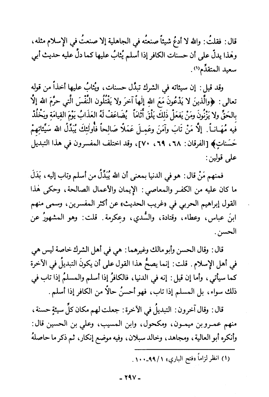 وَقَدْ قِيلَ: إِنَّ سَيِّئَاتِهِ فِي الشِّرْكِ تُبَدَّلُ حَسَنَاتٍ، وَيُثَابُ عَلَيْهَا أَخْذًا مِنْ قَوْلِهِ تَعَالَى: {وَالَّذِينَ لَا يَدْعُونَ مَعَ اللَّهِ إِلَهًا آخَرَ وَلَا يَقْتُلُونَ النَّفْسَ الَّتِي حَرَّمَ اللَّهُ إِلَّا بِالْحَقِّ وَلَا يَزْنُونَ وَمَنْ يَفْعَلْ ذَلِكَ يَلْقَ أَثَامًا - يُضَاعَفْ لَهُ الْعَذَابُ يَوْمَ الْقِيَامَةِ وَيَخْلُدْ فِيهِ مُهَانًا - إِلَّا مَنْ تَابَ وَآمَنَ وَعَمِلَ عَمَلًا صَالِحًا فَأُولَئِكَ يُبَدِّلُ اللَّهُ سَيِّئَاتِهِمْ حَسَنَاتٍ} [الفرقان: 68 - 70] [الْفَرْقَانِ 68 - 69 - 70] ، وَقَدِ اخْتَلَفَ الْمُفَسِّرُونَ فِي هَذَا التَّبْدِيلِ عَلَى قَوْلَيْنِ: فَمِنْهُمْ مَنْ قَالَ: هُوَ فِي الدُّنْيَا بِمَعْنَى أَنَّ اللَّهَ يُبَدِّلُ مَنْ أَسْلَمَ وَتَابَ إِلَيْهِ، بَدَلَ مَا كَانَ عَلَيْهِ مِنَ الْكُفْرِ وَالْمَعَاصِي: الْإِيمَانُ وَالْأَعْمَالُ الصَّالِحَةُ، وَحَكَى هَذَا الْقَوْلَ إِبْرَاهِيمُ الْحَرْبِيُّ فِي " غَرِيبِ الْحَدِيثِ " عَنْ أَكْثَرِ الْمُفَسِّرِينَ، وَسَمَّى مِنْهُمُ ابْنَ عَبَّاسٍ، وَعَطَاءً، وَقَتَادَةَ، وَالسُّدِّيَّ، وَعِكْرِمَةَ قُلْتُ: وَهُوَ الْمَشْهُورُ عَنِ الْحَسَنِ.