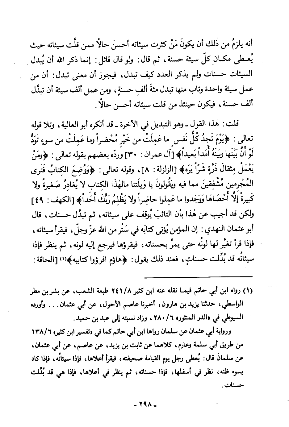 قُلْتُ: هَذَا الْقَوْلُ - وَهُوَ التَّبْدِيلُ فِي الْآخِرَةِ - قَدْ أَنْكَرَهُ أَبُو الْعَالِيَةِ، وَتَلَا قَوْلَهُ تَعَالَى: {يَوْمَ تَجِدُ كُلُّ نَفْسٍ مَا عَمِلَتْ مِنْ خَيْرٍ مُحْضَرًا وَمَا عَمِلَتْ مِنْ سُوءٍ تَوَدُّ لَوْ أَنَّ بَيْنَهَا وَبَيْنَهُ أَمَدًا بَعِيدًا} [آل عمران: 30] (آلِ عِمْرَانَ: 30) وَرَدَّهُ بَعْضُهُمْ بِقَوْلِهِ تَعَالَى: {وَمَنْ يَعْمَلْ مِثْقَالَ ذَرَّةٍ شَرًّا يَرَهُ} [الزلزلة: 8] (الزَّلْزَلَةِ: 8) وَقَوْلِهِ تَعَالَى: {وَوُضِعَ الْكِتَابُ فَتَرَى الْمُجْرِمِينَ مُشْفِقِينَ مِمَّا فِيهِ وَيَقُولُونَ يَاوَيْلَتَنَا مَالِ هَذَا الْكِتَابِ لَا يُغَادِرُ صَغِيرَةً وَلَا كَبِيرَةً إِلَّا أَحْصَاهَا وَوَجَدُوا مَا عَمِلُوا حَاضِرًا وَلَا يَظْلِمُ رَبُّكَ أَحَدًا} [الكهف: 49] (الْكَهْفِ: 49) وَلَكِنْ قَدْ أُجِيبَ عَنْ هَذَا بِأَنَّ التَّائِبَ يُوقَفُ عَلَى سَيِّئَاتِهِ، ثُمَّ تُبَدَّلُ حَسَنَاتٍ، قَالَ أَبُو عُثْمَانَ النَّهْدِيُّ: إِنَّ الْمُؤْمِنَ يُؤْتَى كِتَابَهُ فِي سَتْرٍ مِنَ اللَّهِ عَزَّ وَجَلَّ، فَيَقْرَأُ سَيِّئَاتِهِ، فَإِذَا قَرَأَ تَغَيَّرَ لَهَا لَوْنُهُ حَتَّى يَمُرَّ بِحَسَنَاتِهِ، فَيَقْرَؤُهَا فَيَرْجِعُ إِلَيْهِ لَوْنُهُ، ثُمَّ يَنْظُرُ فَإِذَا سَيِّئَاتُهُ قَدْ بُدِّلَتْ حَسَنَاتٍ، فَعِنْدَ ذَلِكَ يَقُولُ: {هَاؤُمُ اقْرَءُوا كِتَابِيَهْ} [الحاقة: 19] (الْحَاقَّةِ: 19)