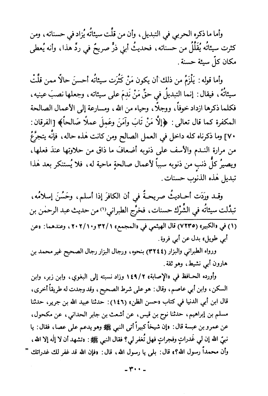 وَأَمَّا مَا ذَكَرَهُ الْحَرْبِيُّ فِي التَّبْدِيلِ، وَأَنَّ مَنْ قَلَّتْ سَيِّئَاتُهُ يُزَادُ فِي حَسَنَاتِهِ، وَمَنْ كَثُرَتْ سَيِّئَاتُهُ يُقَلَّلُ مِنْ حَسَنَاتِهِ، فَحَدِيثُ أَبِي ذَرٍّ صَرِيحٌ فِي رَدِّ هَذَا، وَأَنَّهُ يُعْطَى مَكَانَ كُلِّ سَيِّئَةٍ حَسَنَةً.