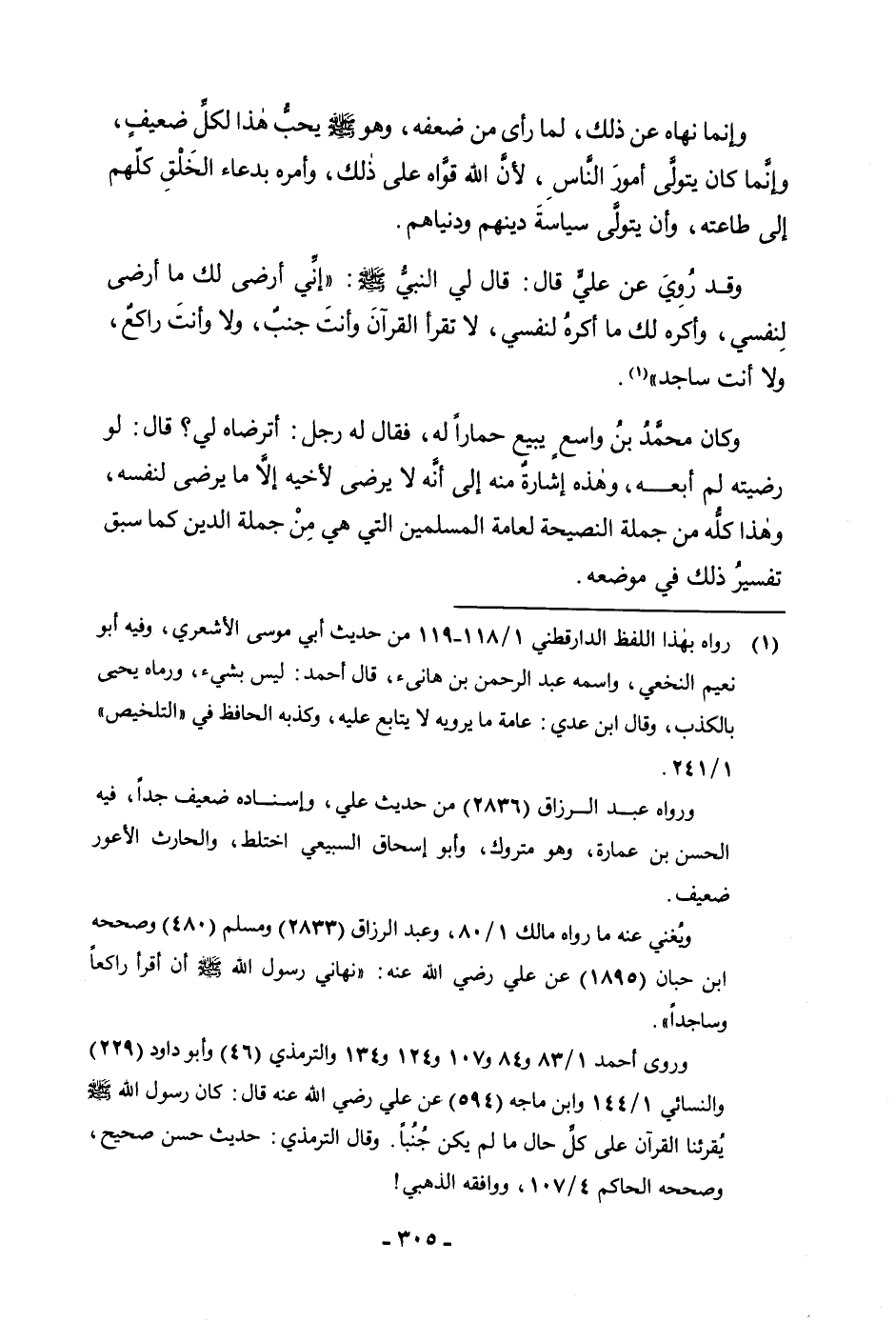 وَقَدْ رُوِيَ «عَنْ عَلِيٍّ قَالَ: قَالَ لِيَ النَّبِيُّ صَلَّى اللَّهُ عَلَيْهِ وَسَلَّمَ إِنِّي أَرْضَى لَكَ مَا أَرْضَى لِنَفْسِي، وَأَكْرَهُ لَكَ مَا أَكْرَهُ لِنَفْسِي، لَا تَقْرَأِ الْقُرْآنَ وَأَنْتَ جُنُبٌ، وَلَا أَنْتَ رَاكِعٌ، وَلَا أَنْتَ سَاجِدٌ» .