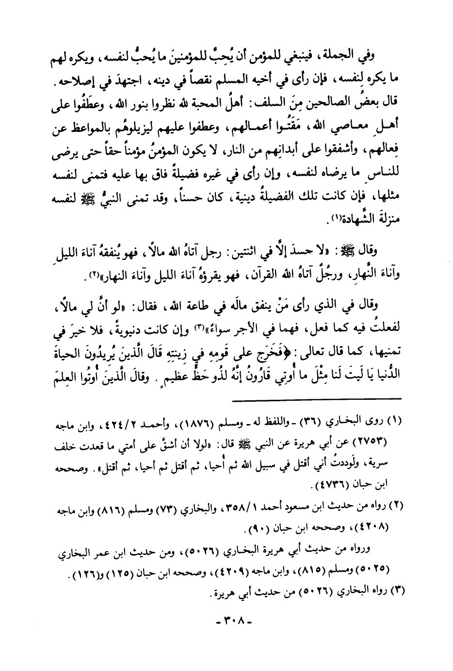 «وَقَالَ فِي الَّذِي رَأَى مَنْ يُنْفِقُ مَالَهُ فِي طَاعَةِ اللَّهِ، فَقَالَ: " لَوْ أَنَّ لِي مَالًا، لَفَعَلْتُ فِيهِ كَمَا فَعَلَ، فَهُمَا فِي الْأَجْرِ سَوَاءٌ» " وَإِنْ كَانَتْ دُنْيَوِيَّةً، فَلَا خَيْرَ فِي تَمَنِّيهَا، كَمَا قَالَ تَعَالَى: {فَخَرَجَ عَلَى قَوْمِهِ فِي زِينَتِهِ قَالَ الَّذِينَ يُرِيدُونَ الْحَيَاةَ الدُّنْيَا يَالَيْتَ لَنَا مِثْلَ مَا أُوتِيَ قَارُونُ إِنَّهُ لَذُو حَظٍّ عَظِيمٍ - وَقَالَ الَّذِينَ أُوتُوا الْعِلْمَ
