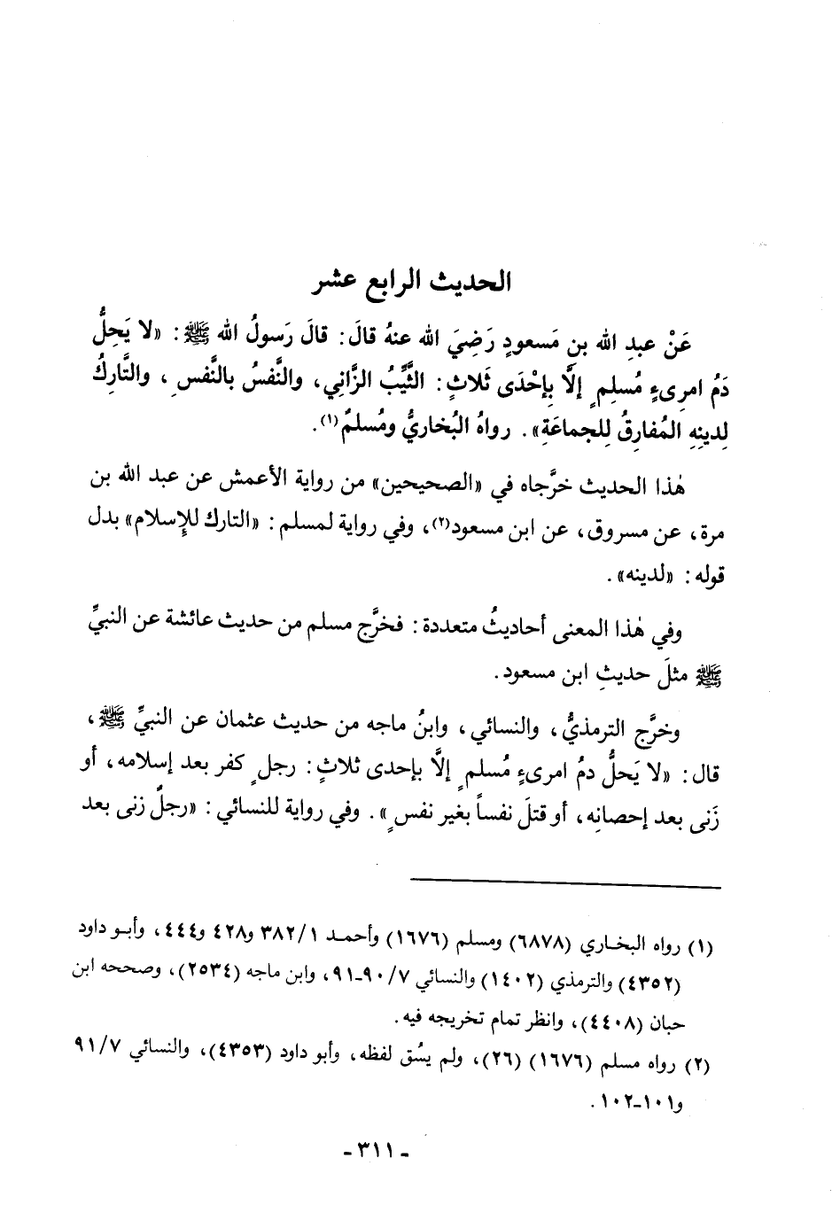عَنْ عَبْدِ اللَّهِ بْنِ مَسْعُودٍ رَضِيَ اللَّهُ عَنْهُ قَالَ: قَالَ رَسُولُ اللَّهِ صَلَّى اللَّهُ عَلَيْهِ وَسَلَّمَ: «لَا يَحِلُّ دَمُ امْرِئٍ مُسْلِمٍ إِلَّا بِإِحْدَى ثَلَاثٍ: الثَّيِّبُ الزَّانِي، وَالنَّفْسُ بِالنَّفْسِ، وَالتَّارِكُ لِدِينِهِ الْمُفَارِقُ لِلْجَمَاعَةِ» رَوَاهُ الْبُخَارِيُّ وَمُسْلِمٌ.