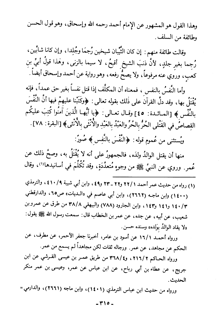 وَيُسْتَثْنَى مِنْ عُمُومِ قَوْلِهِ: {النَّفْسَ بِالنَّفْسِ} [المائدة: 45] صُوَرٌ: مِنْهَا أَنْ يَقْتُلَ الْوَالِدُ وَلَدَهُ، فَالْجُمْهُورُ عَلَى أَنَّهُ لَا يُقْتَلُ بِهِ، وَصَحَّ ذَلِكَ عَنْ عُمَرَ. وَرُوِيَ عَنِ النَّبِيِّ صَلَّى اللَّهُ عَلَيْهِ وَسَلَّمَ مِنْ وُجُوهٍ مُتَعَدِّدَةٍ، وَقَدْ تَكَلَّمَ فِي أَسَانِيدِهَا، وَقَالَ