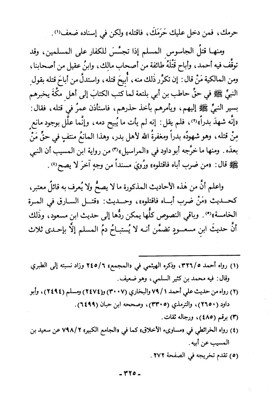 وَاعْلَمْ أَنَّ مِنَ هَذِهِ الْأَحَادِيثِ الْمَذْكُورَةِ مَا لَا يَصِحُّ وَلَا يُعْرَفُ بِهِ قَائِلٌ مُعْتَبَرٌ، كَحَدِيثِ " «مَنْ ضَرَبَ أَبَاهُ فَاقْتُلُوهُ» "، وَحَدِيثِ: " «قَتْلُ السَّارِقِ فِي الْمَرَّةِ الْخَامِسَةِ» " وَبَاقِي النُّصُوصِ كُلُّهَا يُمْكِنُ رَدُّهَا إِلَى حَدِيثِ ابْنِ مَسْعُودٍ، وَذَلِكَ أَنَّ حَدِيثَ ابْنِ مَسْعُودٍ تَضَمَّنَ أَنَّهُ لَا يُسْتَبَاحُ دَمُ الْمُسْلِمِ إِلَّا بِإِحْدَى ثَلَاثِ