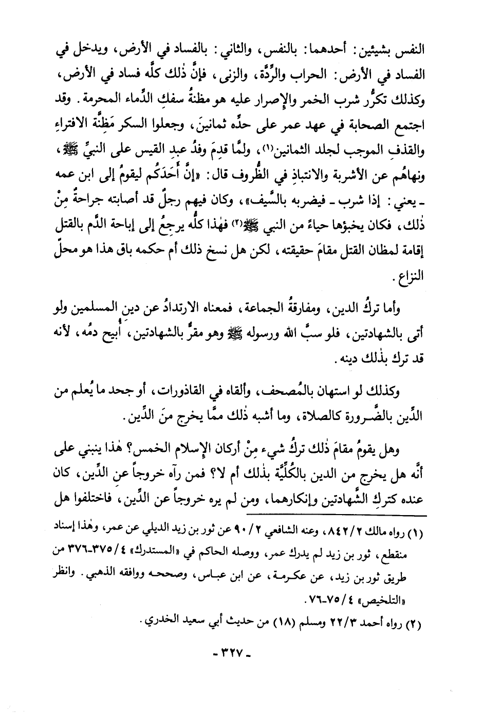 النَّفْسِ بِشَيْئَيْنِ: أَحَدُهُمَا: بِالنَّفْسِ، وَالثَّانِي: بِالْفَسَادِ فِي الْأَرْضِ، وَيَدْخُلُ فِي الْفَسَادِ فِي الْأَرْضِ: الْحِرَابُ وَالرِّدَّةُ، وَالزِّنَا، فَإِنَّ ذَلِكَ كُلَّهُ فَسَادٌ فِي الْأَرْضِ، وَكَذَلِكَ تَكَرُّرُ شُرْبِ الْخَمْرِ وَالْإِصْرَارِ عَلَيْهِ هُوَ مَظِنَّةُ سَفْكِ الدِّمَاءِ الْمُحَرَّمَةِ. وَقَدِ اجْتَمَعَ الصَّحَابَةُ فِي عَهْدِ عُمَرَ عَلَى حَدِّهِ ثَمَانِينَ، وَجَعَلُوا السُّكْرَ مَظِنَّةَ الِافْتِرَاءِ وَالْقَذْفِ الْمُوجِبِ لِجَلْدِ الثَّمَانِينَ، «وَلَمَّا قَدِمَ وَفْدُ عَبْدِ الْقَيْسِ عَلَى النَّبِيِّ صَلَّى اللَّهُ عَلَيْهِ وَسَلَّمَ، وَنَهَاهُمْ عَنِ الْأَشْرِبَةِ وَالِانْتِبَاذِ فِي الظُّرُوفِ قَالَ: " إِنَّ أَحَدَكُمْ لَيَقُومَ إِلَى ابْنِ عَمِّهِ: - يَعْنِي إِذَا شَرِبَ - فَيَضْرِبُهُ بِالسَّيْفِ» "، وَكَانَ فِيهِمْ رَجُلٌ قَدْ أَصَابَتْهُ جِرَاحَةٌ مِنْ ذَلِكَ، فَكَانَ يُخْبِؤُهَا حَيَاءً مِنَ النَّبِيِّ صَلَّى اللَّهُ عَلَيْهِ وَسَلَّمَ فَهَذَا كُلُّهُ يَرْجِعُ إِلَى إِبَاحَةِ الدَّمِ بِالْقَتْلِ إِقَامَةً لِمَظَانِّ الْقَتْلِ مَقَامَ حَقِيقَتِهِ، لَكِنْ هَلْ نَسْخُ ذَلِكَ أَمْ حُكْمُهُ بَاقٍ هَذَا هُوَ مَحَلُّ النِّزَاعِ.