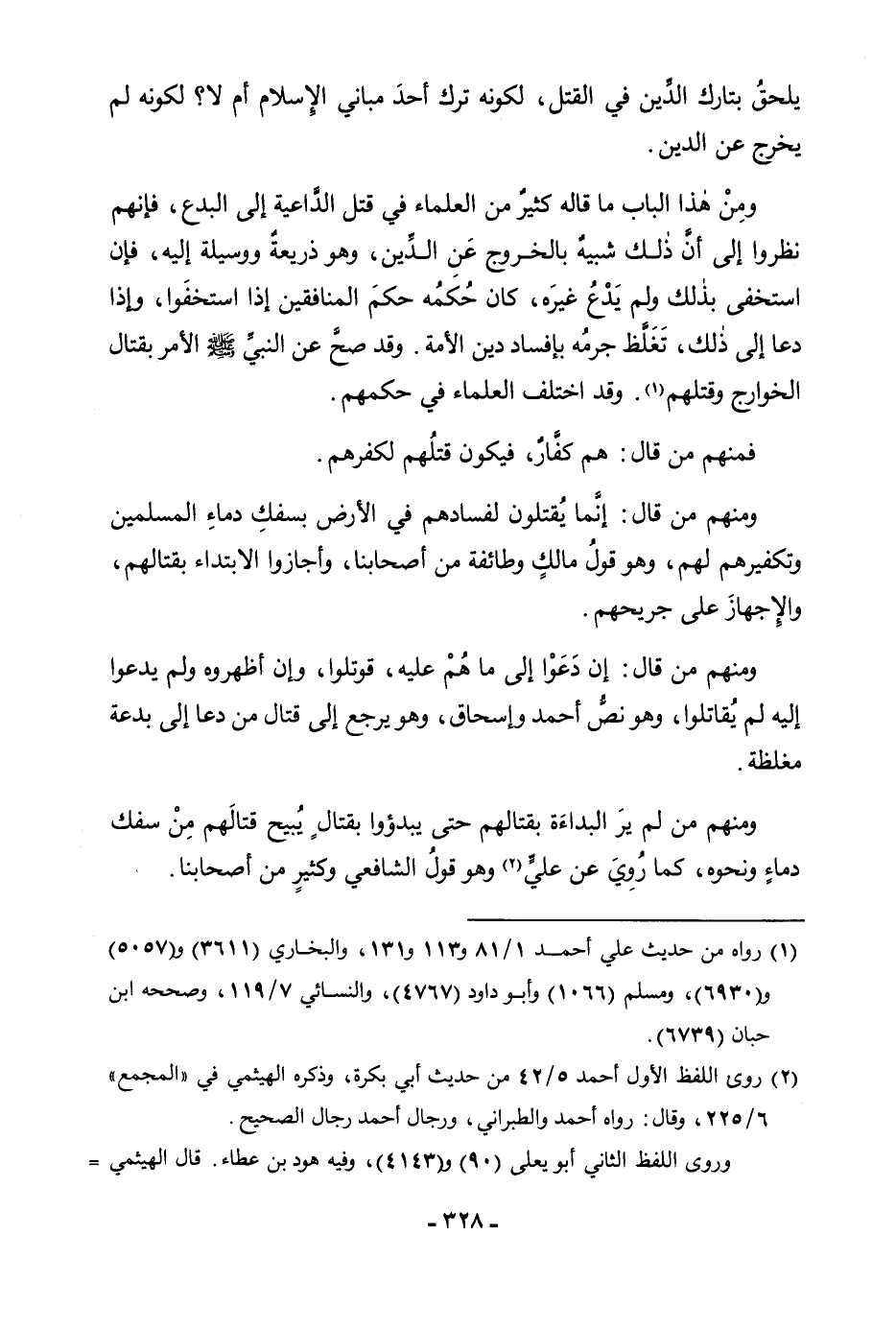 وَمِنْ هَذَا الْبَابِ مَا قَالَهُ كَثِيرٌ مِنَ الْعُلَمَاءِ فِي قَتْلِ الدَّاعِيَةِ إِلَى الْبِدَعِ، فَإِنَّهُمْ نَظَرُوا إِلَى أَنَّ ذَلِكَ شَبِيهٌ بِالْخُرُوجِ عَنِ الدِّينِ، وَهُوَ ذَرِيعَةٌ وَوَسِيلَةٌ إِلَيْهِ، فَإِنِ اسْتَخْفَى بِذَلِكَ وَلَمْ يَدْعُ غَيْرَهُ، كَانَ حُكْمُهُ حُكْمَ الْمُنَافِقِينَ إِذَا اسْتَخَفُّوا، وَإِذَا دَعَا إِلَى ذَلِكَ، تَغَلَّظَ جُرْمُهُ بِإِفْسَادِ دِينِ الْأُمَّةِ. وَقَدْ صَحَّ عَنِ النَّبِيِّ صَلَّى اللَّهُ عَلَيْهِ وَسَلَّمَ الْأَمْرُ بِقِتَالِ الْخَوَارِجِ وَقَتْلِهِمْ. وَقَدِ اخْتَلَفَ الْعُلَمَاءُ فِي حُكْمِهِمْ.