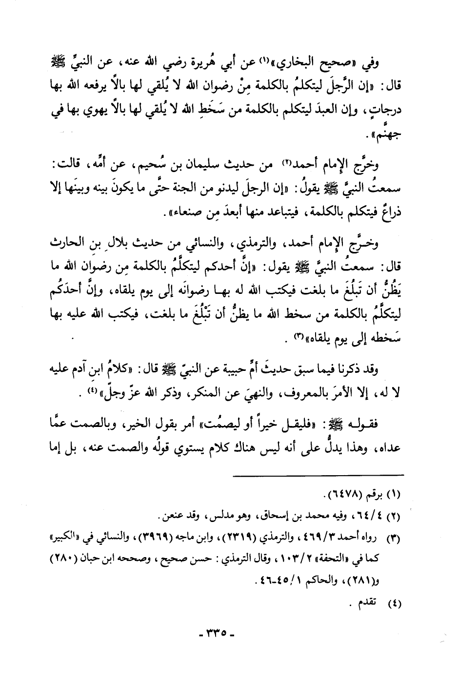 وَخَرَّجَ الْإِمَامُ أَحْمَدُ، وَالتِّرْمِذِيُّ وَالنَّسَائِيُّ مِنْ حَدِيثِ بِلَالِ بْنِ الْحَارِثِ قَالَ: سَمِعْتُ النَّبِيَّ صَلَّى اللَّهُ عَلَيْهِ وَسَلَّمَ يَقُولُ: «إِنَّ أَحَدَكُمْ لَيَتَكَلَّمُ بِالْكَلِمَةِ مِنْ رِضْوَانِ اللَّهِ مَا يَظُنُّ أَنْ تَبْلُغَ مَا بَلَغَتْ فَيَكْتُبُ اللَّهُ بِهَا رِضْوَانَهُ إِلَى يَوْمِ يَلْقَاهُ، وَإِنَّ أَحَدَكُمْ لِيَتَكَلَّمُ بِالْكَلِمَةِ مِنْ سُخْطِ اللَّهِ مَا يَظُنُّ أَنْ تَبْلُغَ مَا بَلَغَتْ، فَيَكْتُبُ اللَّهُ بِهَا سُخْطَهُ إِلَى يَوْمِ يَلْقَاهُ» .