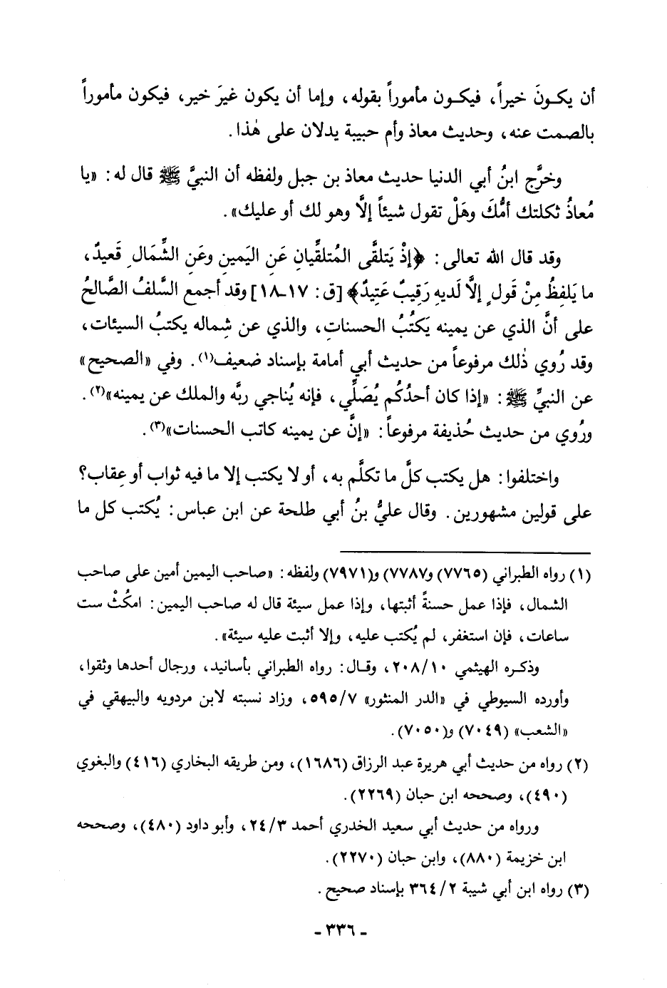 وَخَرَّجَ ابْنُ أَبِي الدُّنْيَا مِنْ حَدِيثِ مُعَاذِ بْنِ جَبَلٍ وَلَفْظُهُ أَنَّ النَّبِيَّ صَلَّى اللَّهُ عَلَيْهِ وَسَلَّمَ قَالَ لَهُ: «يَا مُعَاذُ ثَكِلَتْكَ أُمُّكَ وَهَلْ تَقُولُ شَيْئًا إِلَّا وَهُوَ لَكَ أَوْ عَلَيْكَ» .