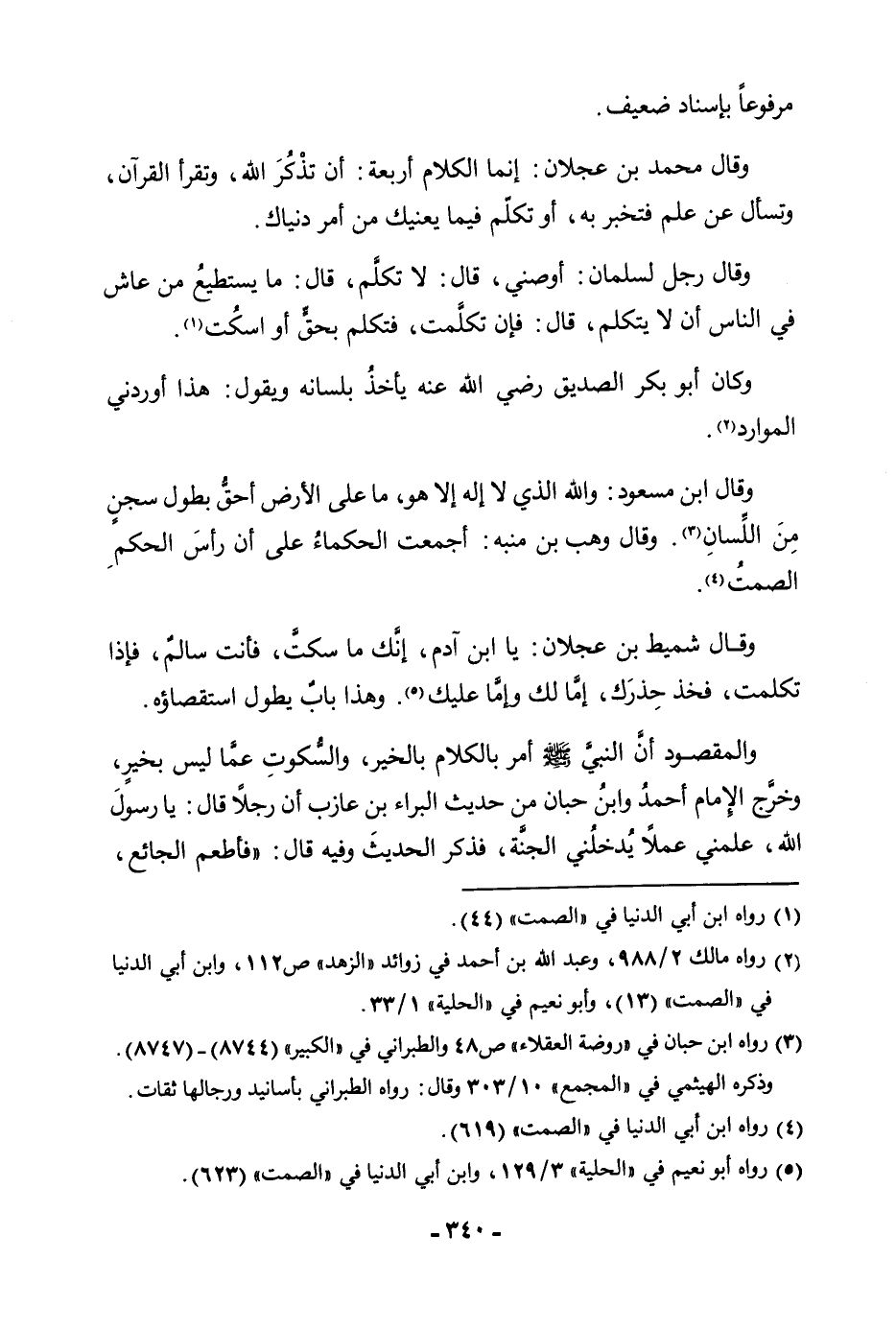 وَقَالَ ابْنُ مَسْعُودٍ: وَاللَّهِ الَّذِي لَا إِلَهَ إِلَّا هُوَ، مَا عَلَى الْأَرْضِ أَحَقُّ بِطُولِ سِجْنٍ مِنَ اللِّسَانِ وَقَالَ وَهْبُ بْنُ مُنَبِّهٍ: أَجْمَعَتِ الْحُكَمَاءُ عَلَى أَنَّ رَأْسَ الْحُكْمِ الصَّمْتُ.