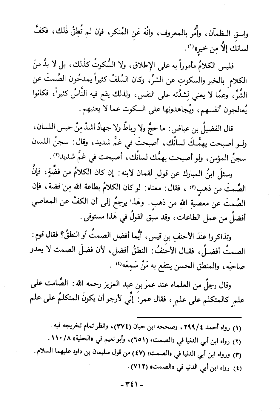 فَلَيْسَ الْكَلَامُ مَأْمُورًا بِهِ عَلَى الْإِطْلَاقِ، وَلَا السُّكُوتُ كَذَلِكَ، بَلْ لَابُدَّ مِنَ الْكَلَامِ بِالْخَيْرِ وَالسُّكُوتِ عَنِ الشَّرِّ، وَكَانَ السَّلَفُ كَثِيرًا يَمْدَحُونَ الصَّمْتَ عَنِ الشَّرِّ، وَعَمَّا لَا يُعْنِي لِشِدَّتِهِ عَلَى النَّفْسِ، وَذَلِكَ يَقَعُ فِيهِ النَّاسُ كَثِيرًا، فَكَانُوا يُعَالِجُونَ أَنْفُسَهُمْ، وَيُجَاهِدُونَهَا عَلَى السُّكُوتِ عَمَّا لَا يَعْنِيهِمْ.