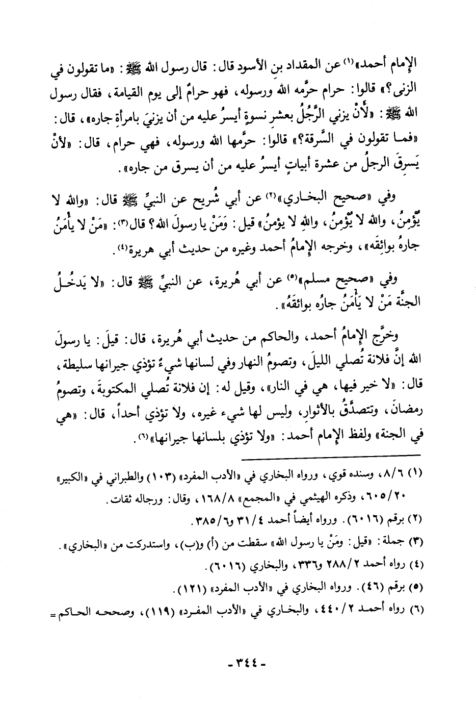 الْإِمَامِ أَحْمَدَ "، عَنِ الْمِقْدَادِ بْنِ الْأَسْوَدِ قَالَ: قَالَ رَسُولُ اللَّهِ صَلَّى اللَّهُ عَلَيْهِ وَسَلَّمَ: «مَا تَقُولُونَ فِي الزِّنَا؟ قَالُوا: حَرَامٌ حَرَّمَهُ اللَّهُ وَرَسُولُهُ، فَهُوَ حَرَامٌ إِلَى يَوْمِ الْقِيَامَةِ، فَقَالَ رَسُولُ اللَّهِ صَلَّى اللَّهُ عَلَيْهِ وَسَلَّمَ: لَأَنْ يَزْنِيَ الرَّجُلُ بِعَشْرِ نِسْوَةٍ أَيْسَرُ عَلَيْهِ مِنْ أَنْ يَزْنِيَ بِامْرَأَةِ جَارِهِ، قَالَ: فَمَا تَقُولُونَ فِي السَّرِقَةِ؟ قَالُوا: حَرَامٌ حَرَّمَهَا اللَّهُ وَرَسُولُهُ، فَهِيَ حَرَامٌ، قَالَ: لَأَنْ يَسْرِقَ الرَّجُلُ مِنْ عَشَرَةِ أَبْيَاتٍ أَيْسَرُ عَلَيْهِ مِنْ أَنْ يَسْرِقَ مِنْ جَارِهِ» .