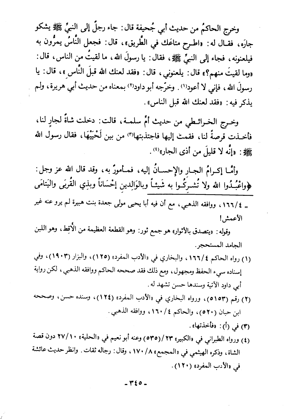فَأَمَّا إِكْرَامُ الْجَارِ وَالْإِحْسَانُ إِلَيْهِ، فَمَأْمُورٌ بِهِ، وَقَدْ قَالَ اللَّهُ عَزَّ وَجَلَّ {وَاعْبُدُوا اللَّهَ وَلَا تُشْرِكُوا بِهِ شَيْئًا وَبِالْوَالِدَيْنِ إِحْسَانًا وَبِذِي الْقُرْبَى وَالْيَتَامَى