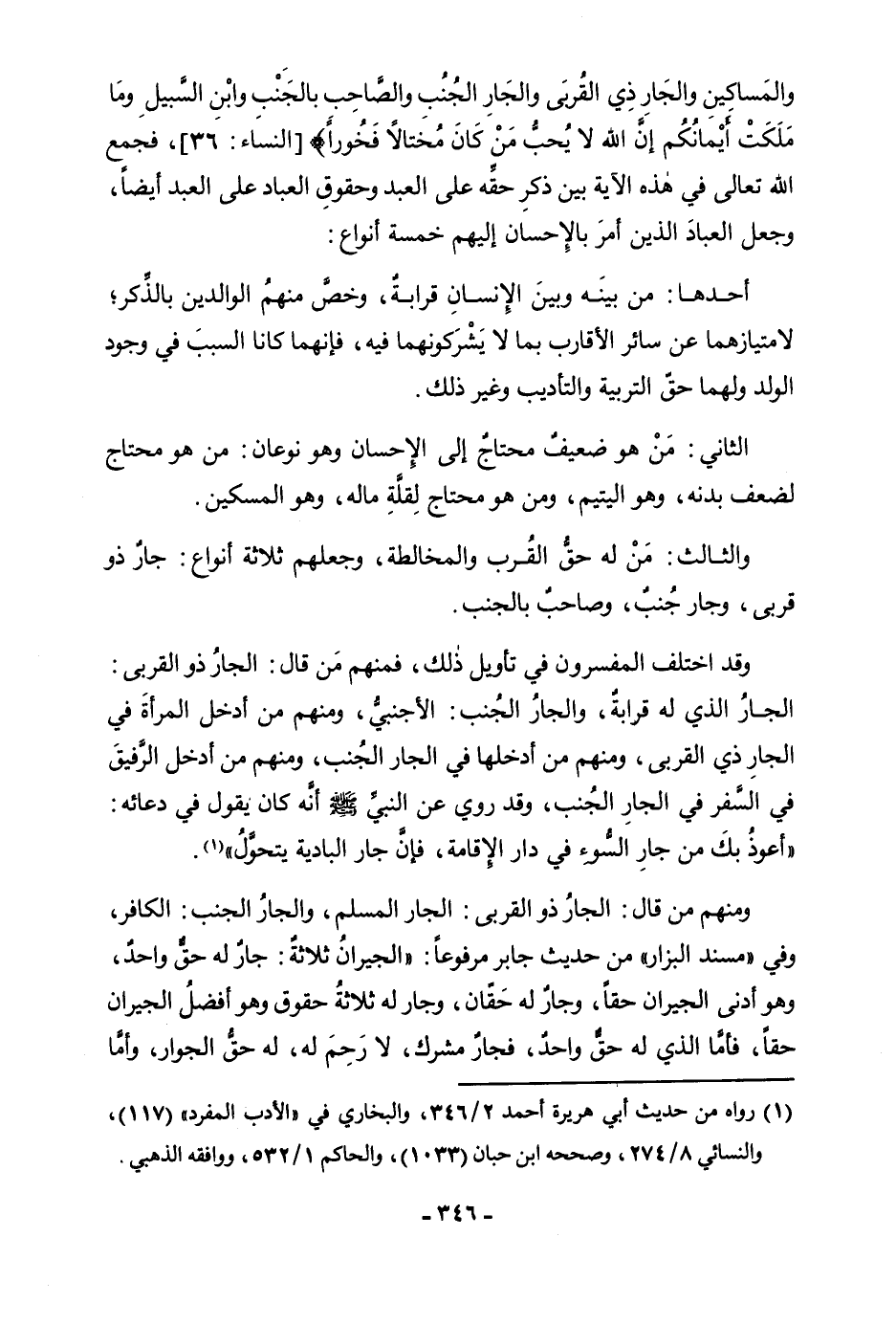 وَالْمَسَاكِينِ وَالْجَارِ ذِي الْقُرْبَى وَالْجَارِ الْجُنُبِ وَالصَّاحِبِ بِالْجَنْبِ وَابْنِ السَّبِيلِ وَمَا مَلَكَتْ أَيْمَانُكُمْ إِنَّ اللَّهَ لَا يُحِبُّ مَنْ كَانَ مُخْتَالًا فَخُورًا} [النساء: 36] [النِّسَاءِ: 36] ، فَجَمَعَ اللَّهُ تَعَالَى فِي هَذِهِ الْآيَةِ بَيْنَ ذِكْرِ حَقِّهِ عَلَى الْعَبْدِ وَحُقُوقِ الْعِبَادِ عَلَى الْعِبَادِ أَيْضًا، وَجَعَلَ الْعِبَادَ الَّذِينَ أُمِرَ بِالْإِحْسَانِ إِلَيْهِمْ خَمْسَةَ أَنْوَاعٍ: أَحَدُهَا: مَنْ بَيْنَهُ وَبَيْنَ الْإِنْسَانِ قَرَابَةٌ، وَخُصَّ مِنْهُمُ الْوَالِدَيْنِ بِالذِّكْرِ؛ لِامْتِيَازِهِمَا عَنْ سَائِرِ الْأَقَارِبِ بِمَا لَا يُشْرِكُونَهُمَا فِيهِ، فَإِنَّهُمَا كَانَا السَّبَبَ فِي وُجُودِ الْوَلَدِ وَلَهُمَا حَقُّ التَّرْبِيَةِ وَالتَّأْدِيبِ وَغَيْرِ ذَلِكَ.