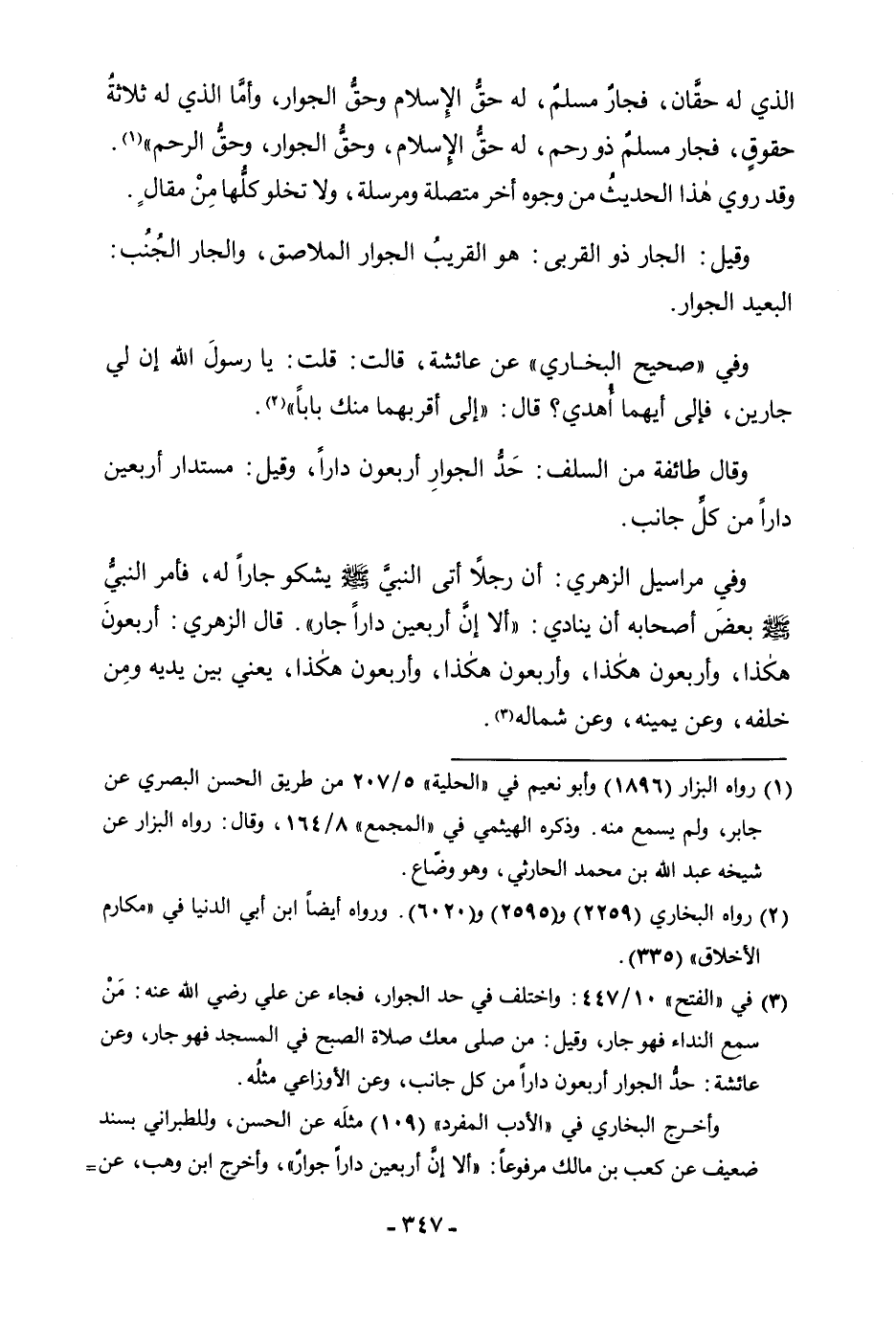 الَّذِي لَهُ حَقَّانِ، فَجَارٌ مُسْلِمٌ، لَهُ حَقُّ الْإِسْلَامِ وَحَقُّ الْجِوَارِ، وَأَمَّا الَّذِي لَهُ ثَلَاثَةُ حُقُوقٍ، فَجَارٌ مُسْلِمٌ ذُو رَحِمٍ، فَلَهُ حَقُّ الْإِسْلَامِ، وَحَقُّ الْجِوَارِ، وَحَقُّ الرَّحِمِ "، وَقَدْ رُوِيَ هَذَا الْحَدِيثُ مِنْ وُجُوهٍ أُخْرَى مُتَّصِلَةٍ وَمُرْسَلَةٍ، وَلَا تَخْلُو كُلُّهَا مِنْ مَقَالٍ.