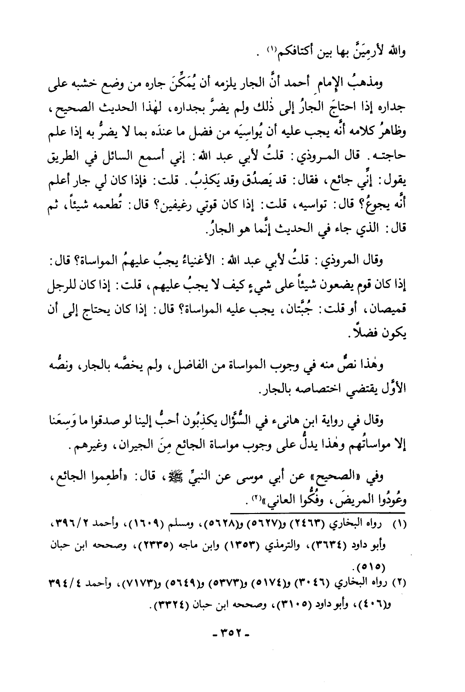 وَمَذْهَبُ الْإِمَامِ أَحْمَدَ أَنَّ الْجَارَ يَلْزَمُهُ أَنْ يُمَكِّنَ جَارَهُ مِنْ وَضْعِ خَشَبِهِ عَلَى جِدَارِهِ إِذَا احْتَاجَ الْجَارُ إِلَى ذَلِكَ وَلَمْ يَضُرَّ بِجِدَارِهِ، لِهَذَا الْحَدِيثِ الصَّحِيحِ، وَظَاهِرُ كَلَامِهِ أَنَّهُ يَجِبُ عَلَيْهِ أَنْ يُوَاسِيَهُ مِنْ فَضْلِ مَا عِنْدَهُ بِمَا لَا يَضُرُّ بِهِ إِذَا عَلِمَ حَاجَتَهُ قَالَ الْمَرْوَزِيُّ: قُلْتُ لِأَبِي عَبْدِ اللَّهِ: إِنِّي أَسْمَعُ السَّائِلَ فِي الطَّرِيقِ يَقُولُ: إِنِّي جَائِعٌ، فَقَالَ: قَدْ يَصْدُقُ وَقَدْ يَكْذِبُ. قُلْتُ: فَإِذَا كَانَ لِي جَارٌ أَعْلَمُ أَنَّهُ يَجُوعُ؟ قَالَ: تُوَاسِيهِ، قُلْتُ: إِذَا كَانَ قُوَّتِي رَغِيفَيْنِ؟ قَالَ: تُطْعِمُهُ شَيْئًا، ثُمَّ قَالَ: الَّذِي جَاءَ فِي الْحَدِيثِ إِنَّمَا هُوَ الْجَارُ.