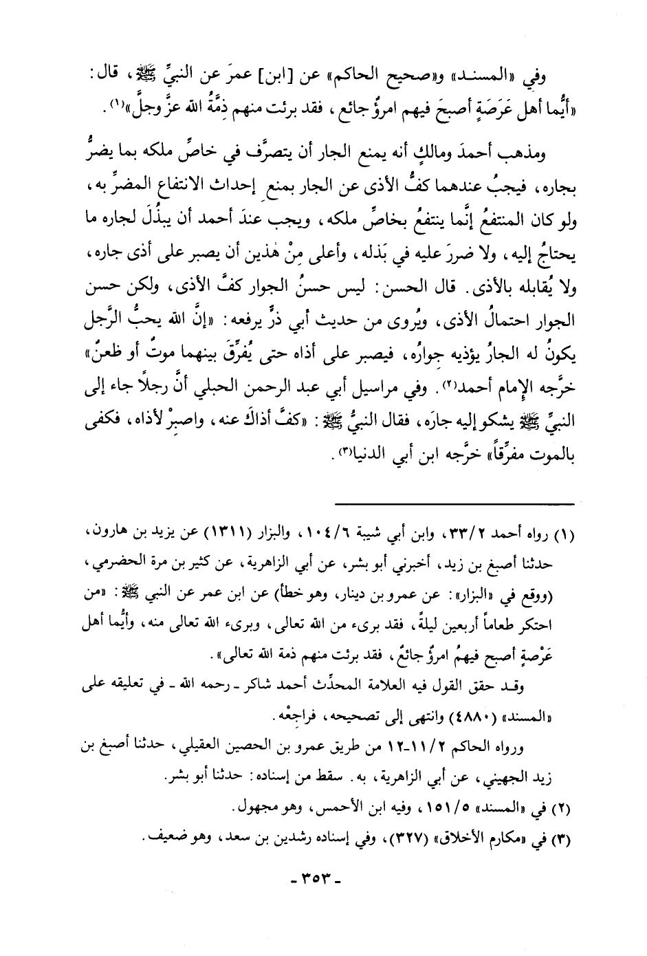 وَفِي " الْمُسْنَدِ " وَ " صَحِيحِ الْحَاكِمِ " عَنِ [ابْنِ] عُمَرَ، عَنِ النَّبِيِّ صَلَّى اللَّهُ عَلَيْهِ وَسَلَّمَ، قَالَ: «أَيُّمَا أَهْلُ عَرْصَةٍ أَصْبَحَ فِيهِمُ امْرُؤٌ جَائِعٌ، فَقَدْ بَرِئَتْ مِنْهُمْ ذِمَّةُ اللَّهِ عَزَّ وَجَلَّ» .