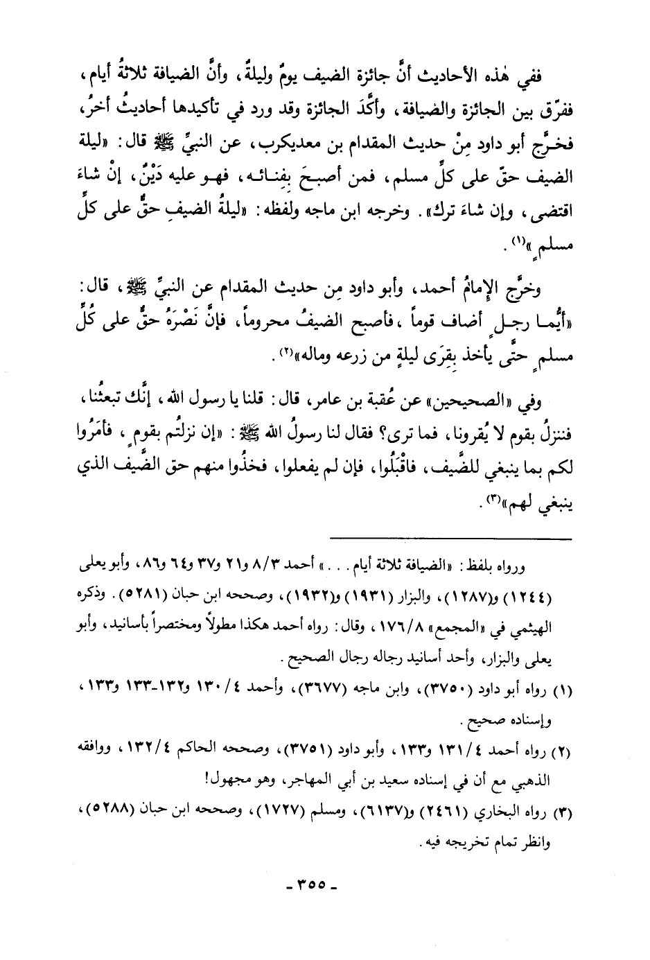 فَفِي هَذِهِ الْأَحَادِيثِ أَنَّ جَائِزَةَ الضَّيْفِ يَوْمٌ وَلَيْلَةٌ، وَأَنَّ الضِّيَافَةَ ثَلَاثَةُ أَيَّامٍ، فَفَرَّقَ بَيْنَ الْجَائِزَةِ وَالضِّيَافَةِ، وَكَذَا الْجَائِزَةُ قَدْ وَرَدَ فِي تَأْكِيدِهَا أَحَادِيثُ أُخَرُ، فَخَرَّجَ أَبُو دَاوُدَ مِنْ حَدِيثِ الْمِقْدَامِ بْنِ مَعَدِّ يَكْرِبَ، عَنِ النَّبِيِّ صَلَّى اللَّهُ عَلَيْهِ وَسَلَّمَ قَالَ: " «لَيْلَةُ الضَّيْفِ حَقٌّ عَلَى كُلِّ مُسْلِمٍ، فَمَنْ أَصْبَحَ بِفِنَائِهِ، فَهُوَ عَلَيْهِ دَيْنٌ، إِنْ شَاءَ اقْتَضَى، وَإِنْ شَاءَ تُرِكَ» ". وَخَرَّجَهُ ابْنُ مَاجَهْ وَلَفْظُهُ: " «لَيْلَةُ الضَّيْفِ حَقٌّ عَلَى كُلِّ مُسْلِمٍ» ".