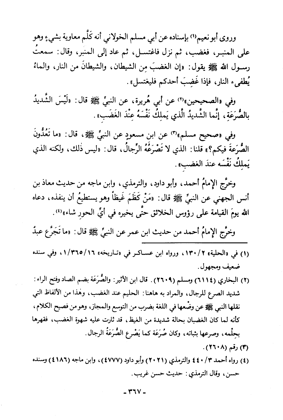 وَرَوَى أَبُو نُعَيْمٍ بِإِسْنَادِهِ عَنْ أَبِي مُسْلِمٍ الْخَوْلَانِيِّ أَنَّهُ كَلَّمَ مُعَاوِيَةَ بِشَيْءٍ وَهُوَ عَلَى الْمِنْبَرِ، فَغَضِبَ ثُمَّ نَزَلَ فَاغْتَسَلَ، ثُمَّ عَادَ إِلَى الْمِنْبَرِ، وَقَالَ: سَمِعْتُ رَسُولَ اللَّهِ صَلَّى اللَّهُ عَلَيْهِ وَسَلَّمَ يَقُولُ: «إِنَّ الْغَضَبَ مِنَ الشَّيْطَانِ، وَالشَّيْطَانُ مِنَ النَّارِ، وَالْمَاءُ يُطْفِئُ النَّارَ، فَإِذَا غَضِبَ أَحَدُكُمْ فَلْيَغْتَسِلْ» . وَفِي " الصَّحِيحَيْنِ " عَنْ أَبِي هُرَيْرَةَ، عَنِ النَّبِيِّ صَلَّى اللَّهُ عَلَيْهِ وَسَلَّمَ قَالَ: «لَيْسَ الشَّدِيدُ بِالصُّرَعَةِ، وَإِنَّمَا الشَّدِيدُ الَّذِي يَمْلِكُ نَفْسَهُ عِنْدَ الْغَضَبِ» . وَفِي " صَحِيحِ مُسْلِمٍ " عَنِ ابْنِ مَسْعُودٍ، عَنِ النَّبِيِّ صَلَّى اللَّهُ عَلَيْهِ وَسَلَّمَ قَالَ: «مَا تَعُدُّونَ الصُّرَعَةَ فِيكُمْ؟ قُلْنَا: الَّذِي لَا تَصْرَعُهُ الرِّجَالُ، قَالَ: لَيْسَ ذَلِكَ، وَلَكِنَّهُ الَّذِي يَمْلِكُ نَفْسَهُ عِنْدَ الْغَضَبِ» . وَخَرَّجَ الْإِمَامُ أَحْمَدُ، وَأَبُو دَاوُدَ، وَالتِّرْمِذِيُّ، وَابْنُ مَاجَهْ مِنْ حَدِيثِ مُعَاذِ بْنِ أَنَسٍ الْجُهَنِيِّ عَنِ النَّبِيِّ صَلَّى اللَّهُ عَلَيْهِ وَسَلَّمَ قَالَ: «مَنْ كَظَمَ غَيْظًا وَهُوَ يَسْتَطِيعُ أَنْ يُنْفِذَهُ، دَعَاهُ اللَّهُ يَوْمَ الْقِيَامَةِ عَلَى رُؤُوسِ الْخَلَائِقِ حَتَّى يُخَيِّرَهُ فِي أَيِّ الْحُورِ شَاءَ» . وَخَرَّجَ الْإِمَامُ أَحْمَدُ مِنْ حَدِيثِ ابْنِ عُمَرَ، عَنِ النَّبِيِّ صَلَّى اللَّهُ عَلَيْهِ وَسَلَّمَ قَالَ: «مَا تَجَرَّعَ عَبْدٌ